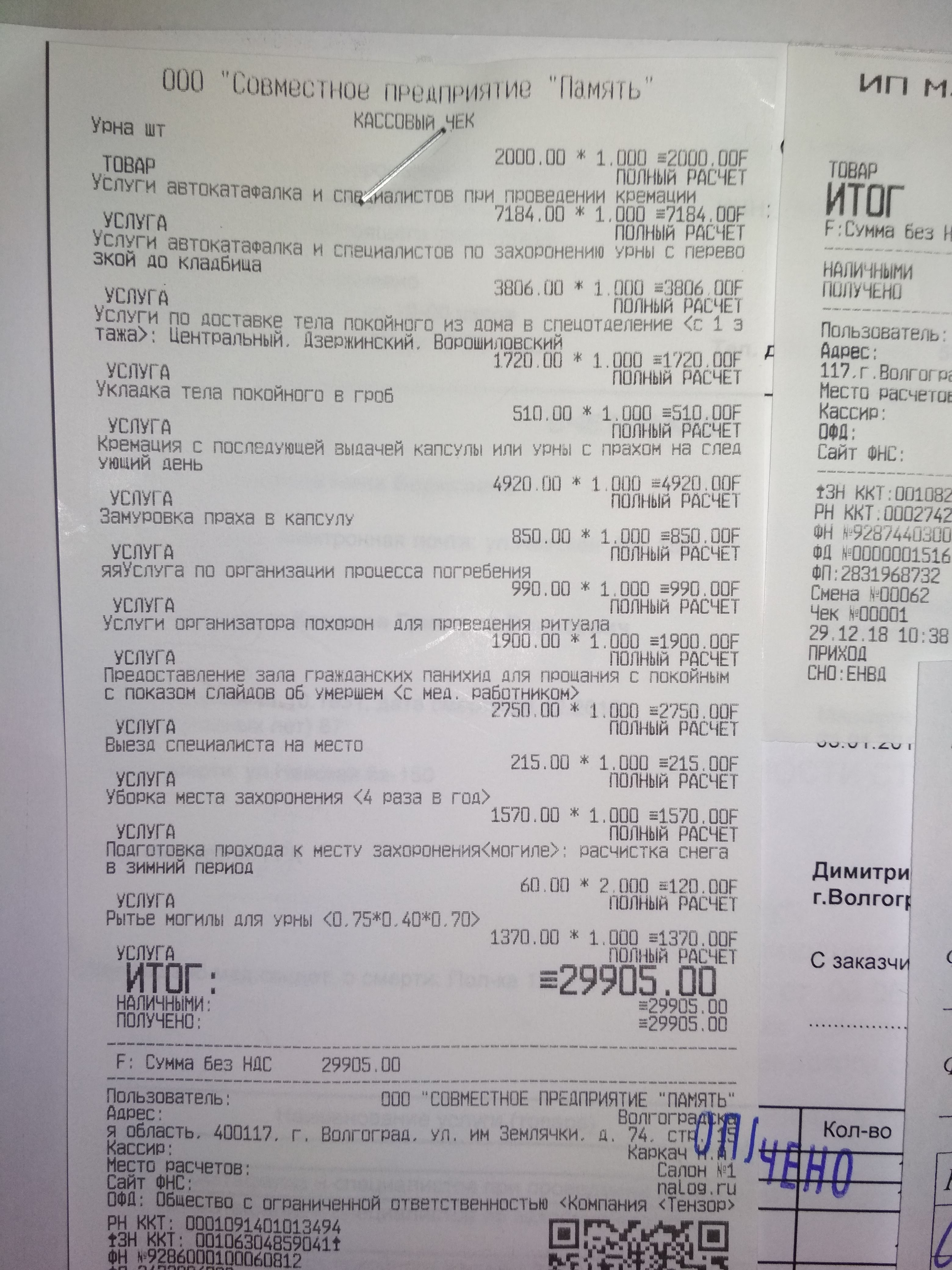 28.12.2018 дело было. Скончался дома, справку получили сразу в поликлиники, т.е. вскрытие не делали. Для этого заранее поговорили с врачом, дело к тому шло. Позвонили в память уже со справкой о смерти на руках. Т.е. приехали, забрали тело. Т.к. справка о смерти была на руках, то сам заехал в ЗАГС. Там быстренько получил свидетельство. Без него кремации не будет. Кремировали, чтобы сделать подзахоронение на Дмитровском в семейную могилу (места там маловато). Покойный не крещёный, атеистичный человек — от всех обрядов отказались, чтобы не оскорблять память покойного. Гражданское прощание делали в зале при Памяти на Больничном комплексе. Обед сделали в кафе там же. Это удобно и вполне по деньгам доступно. В итоге наша небольшая семья никуда не моталась, не каталась, не заказывали автобусы и прочее. По стоимости: 52585 ₽ + кафе 7240 ₽ (на 12 человек). Пара моментов по кремации, если нужно. Вы оплачиваете простой, но вполне достойный гроб (дорогой с шелками или лаком нельзя кремировать), урну и работы по кремации. На кладбище, соответственно рытье небольшой могилы. Когда вы прощаетесь с покойным в зале, его закрывают в гроб и увозят на машине, а вы уходите обедать, общаться, и далее по своим делам. Сама кремация проходит по определенным дням без присутствия родных. На следующий день после кремации вы приезжаете на кладбище малым составом — самые близкие родственники . Человек 2-5. Вас встретит бригада с катофалком, которая с вами проследует до могилы. Так же поставят урночку на пьедестал и вы скажете несколько слов. После чего, металлическую урну поставят в деревянный ящик и закопают в могилу.