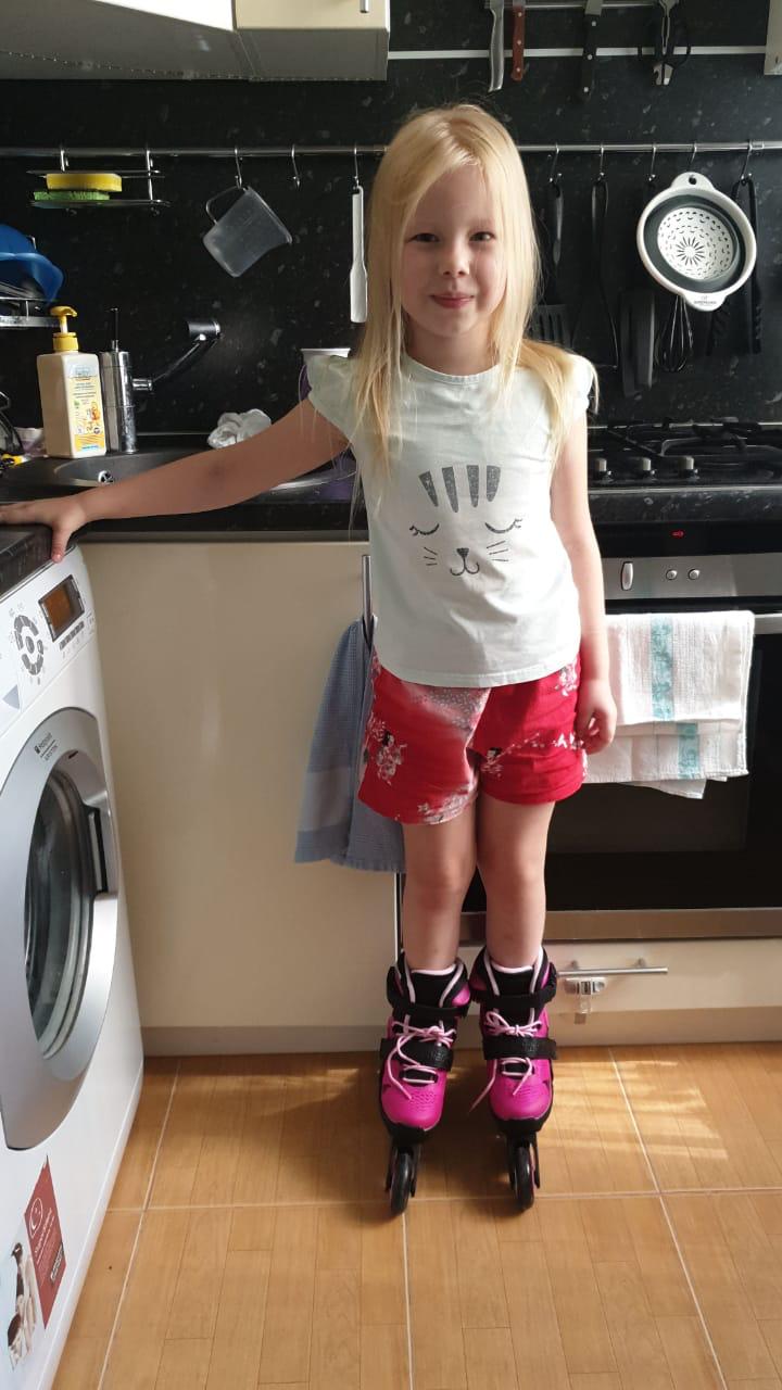 Дополнение к своему сообщению от 01.04.2019 Выбрала я ролики, Rollerblade Cube G pink/bubblegum, в комплекте защита колени, локти, перчатки и шлем. И купили в августе 2019 года, Даше 5л6м. Сразу и надела, с поддержкой покаталась. Потом потихоньку сама, так и научилась. Как пришли дожди и грязь, на улицу брать перестали, иногда надевает их дома. Ждёт весну) Диме на 2г Крестная подарила беговел B.TWIN Run Ride 520, собственно такой же как был и у Даши. Сейчас Диме 2г1м, садится, учится кататься. На самокате в 1г6м Диме убрали сиденье, поставили Т-образную ручку, научился кататься в 1г11м.