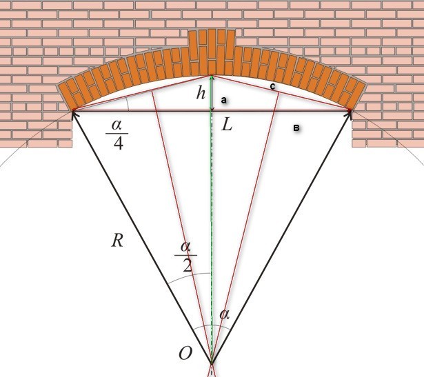 На рисунке 1 показана арочная перемычка над пролетом L = 2.35 м, стрела арки принята равной h = 4·0.077 = 0.308 м. Но для того, чтобы проектировать перемычку, нужно знать не просто длину пролета, а длину дуги окружности, другими словами - длину арки по низу. Так как по этой окружности будут выкладываться кирпичи, и чтобы не заниматься их подгонкой по размерам, особенно если таких арочных перемычек планируется сделать много, то длина арки должна быть приблизительно кратна 0.07-0.075 м. Знания, переданные нам древнегреческими геометрами, позволяют по высоте и длине пролета определить длину арки, но сначала придется определить угол а. Так как: