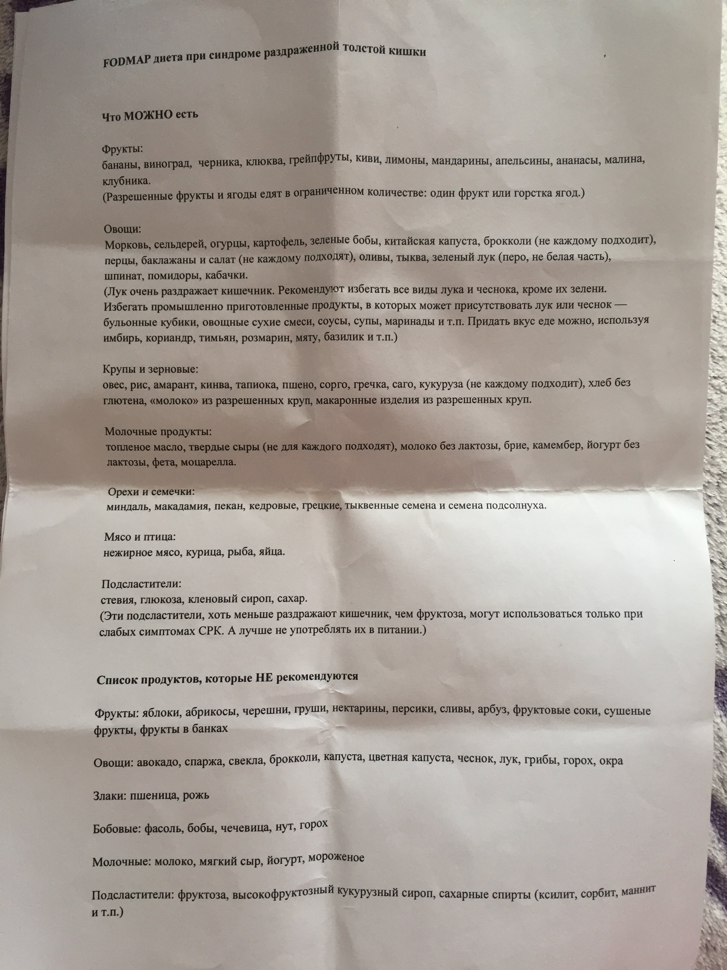 О-па. Мне гастроэнтеролог распечатывал диету при СРК, там вроде не так много и запрещено было... Почепцов, советую у него проконсультироваться, если доведётся. Вообще СРК - это ж не болезнь, а синдром... это "диагноз исключения", большая помойка, куда все непонятное валят. проверили на всякие бяки типа Крона, совокупность симптомов остаётся - пишут СРК. В принципе, он же не лечится как таковой, лечение только симптоматическое. СРК - это или поносы, или запоры, или они по очереди, или спазмы. Вот их и лечат. Или не лечат, если сильно не мешают жить. Такая особенность организма. У кого-то уши оттопыренные, а у кого-то кишечник капризный.