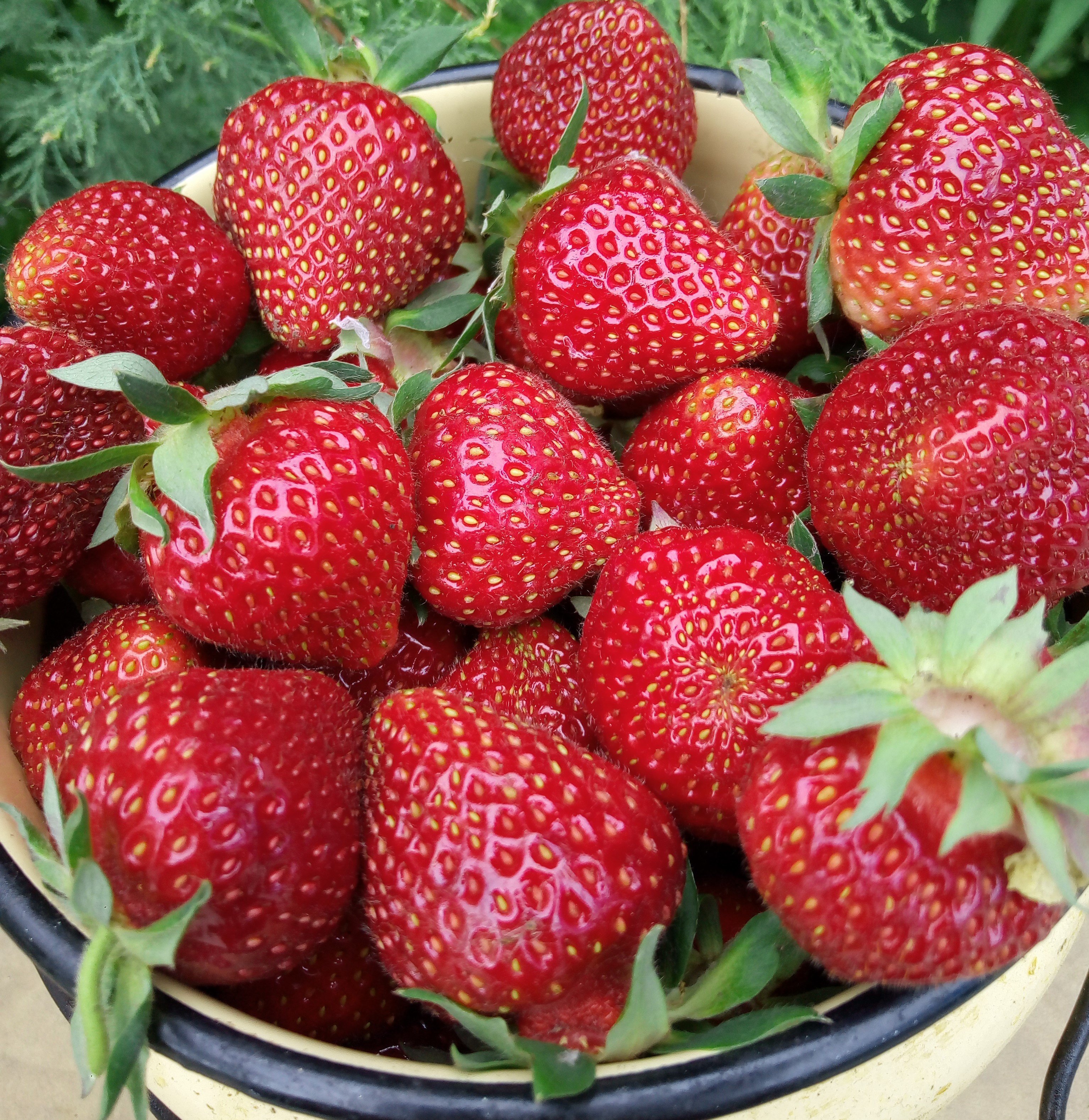 >Куст плохо видно с цветами на фоточке, но так-то красиво цветет, все лето причем. Это про малиновую. А вот светло-розовая скорее тоже ремонтантная, но я немного засомневалась. Я после того как пищевой интерес к ней утратила за ней вообще не смотрела, решила, что будет декоративной. Жудь вообще... >Я их сейчас в клумбе развожу :-) Малиновая на цикламен похожа «Их» - это оказывается только про розовую, а я думала, что про обе. Я в конце прошлого сезона решила обе цветные клубники подсадить в клумбу. Но сегодня внимательно посмотрела (ну не до клумб мне, мне бы продовольственную программу выполнить, задание давала старшим поливать и всё) — прижилась только розовая,а малиновая вся дохлая. Малиновая — безусая, я помню, что я куст делила, когда отсаживала. Может она слишком молодая была для этого (сейчас почитала — вроде пишут, что делением куста только 3-4-летний куст можно размножить). По виду это Тристан f1 был, очень похоже, но хз. Еще пишут, что он вообще делением куста не может размножиться, типа, покупайте семена. А, правда, может делением или нет? Это плоды от обычной "усатой" клубники с белыми цветами, тоже какая-то сортовая, она хорошо нам зашла. Это третья клубника из тех, кто участвует в описанном абсурде.