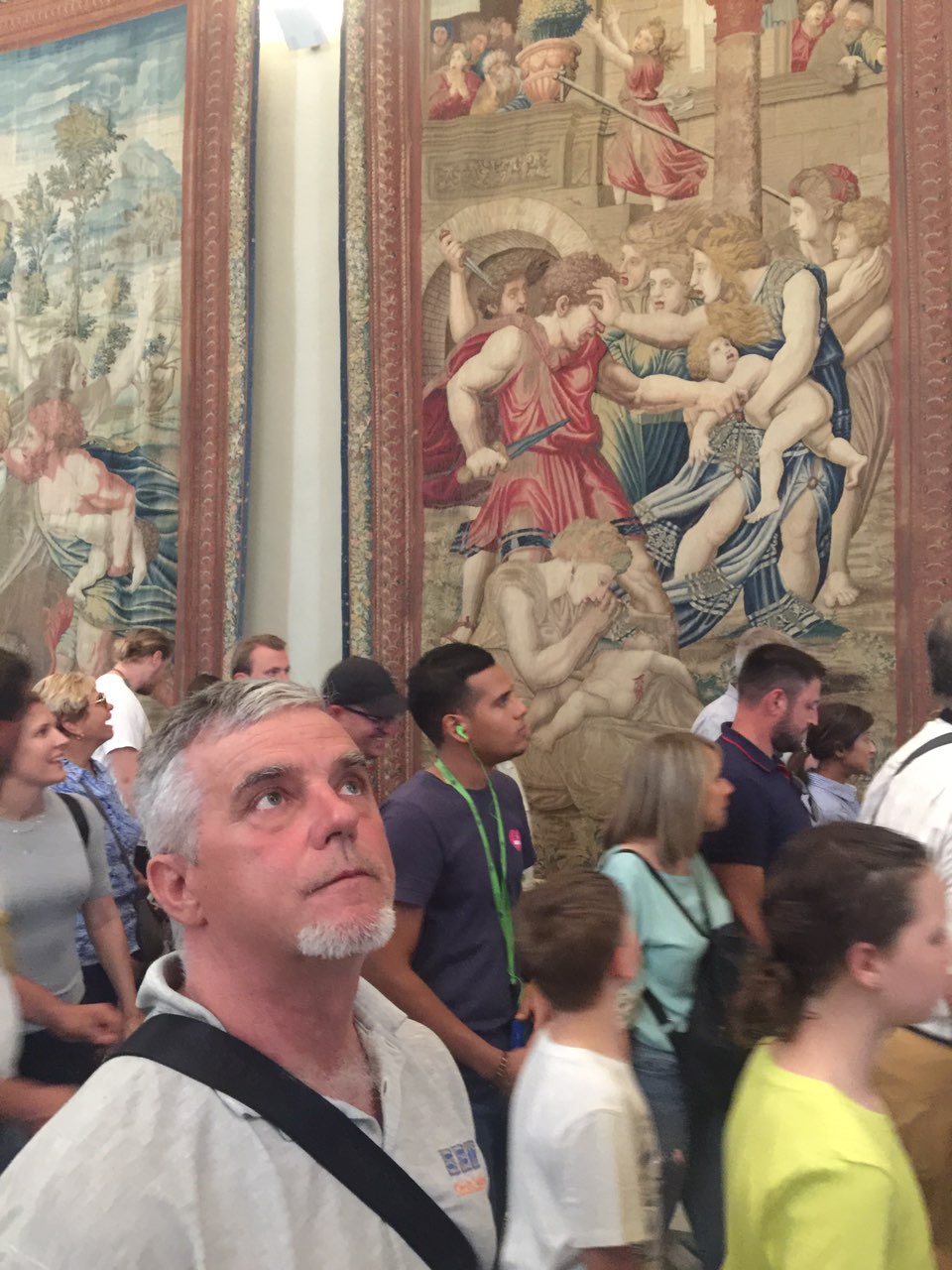 Продолжу. Поезд наш frecciargento 8302 прибыл и отправился четко по расписанию . Отправились 8.27 и в 11.23 должны быть уже в Риме ! Расстояние около 300 км. Быстро шпарит ! Суперскоростные поезда Италии: FrecciaRossa, FrecciaBianca, FrecciaRgento Едем. Попутчики сплошные итальянцы. Общаемся насколько это возможно жестами. Билеты покупал выбирал у окна-все интереснее поездка. Все хорошо летим все ближе к пожалуй главной цели нашей поездки. Древний Рим и Ватикан ! Остается езды минут 40 . И тут такая засада ! Поезд останавливается стоит минут 15 и потом задним ходом нас загоняют в какой то тоннель . Вот это да ! Стоим 30 минут -час. Мы в шоке. У нас билеты в музеи Ватикана включая обед в ресторане на 14.00. Пытаюсь понять что происходит и выясняю что неполадки на линии -сколько простоим неизвестно. Эх печаль ! А ведь еще надо куда то по приезду куда то деть багаж уже тяжелый. И главное еще надо найти отель . ( судя по отзывам он в жилом доме и найти его еще суметь надо ! ) В общем простояли мы 1.5 часа и прибыли с опозданием . Но нам повезло- мы все успели. Решение было принято мчаться сразу в отель и оставить там весь багаж . Круто повезло что выспрашивая у прохожих как пройти в отель- мужик оказался жителем этого дома и довел нас прямо до двери ! Вот это удача ! . Отель еще и оказался рядом со станцией метро в 2 остановках от Ватикана . Бросили все в отеле и помчались в Музеи. Очередь приличная но у кого билеты куплены он-лайн проходят быстро. Прошли все процедуры безопасности. В окошке получили входные билеты предъявив наши бумажки и помчались ! Куда ? Конечно в ресторан ! Не пропадать же обеду оплаченному. Тем более что уже и проголодались и вода нужна -пришла жара а ходить планируем долго. В общем набрали что хотели. Обед сытный и на выбор . Взяли воды с собой и окунулись в это великолепие. ! !!! А ведь это ковры-ткань ! Я так понимаю