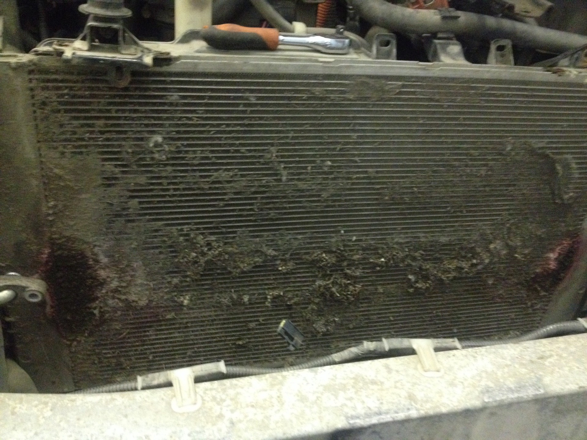 Такая же фигня, правда на охлаждение двигателя и работу климата это никак не влияло, но в этом году впервые за 3 года решил почистить радиаторы. Кондёрный был был относительно чист, а вот между ним и радиатором ДВС было довольно много грязи, эдакий валенок из пыли. Примерно вот так выглядело, фото не моё.