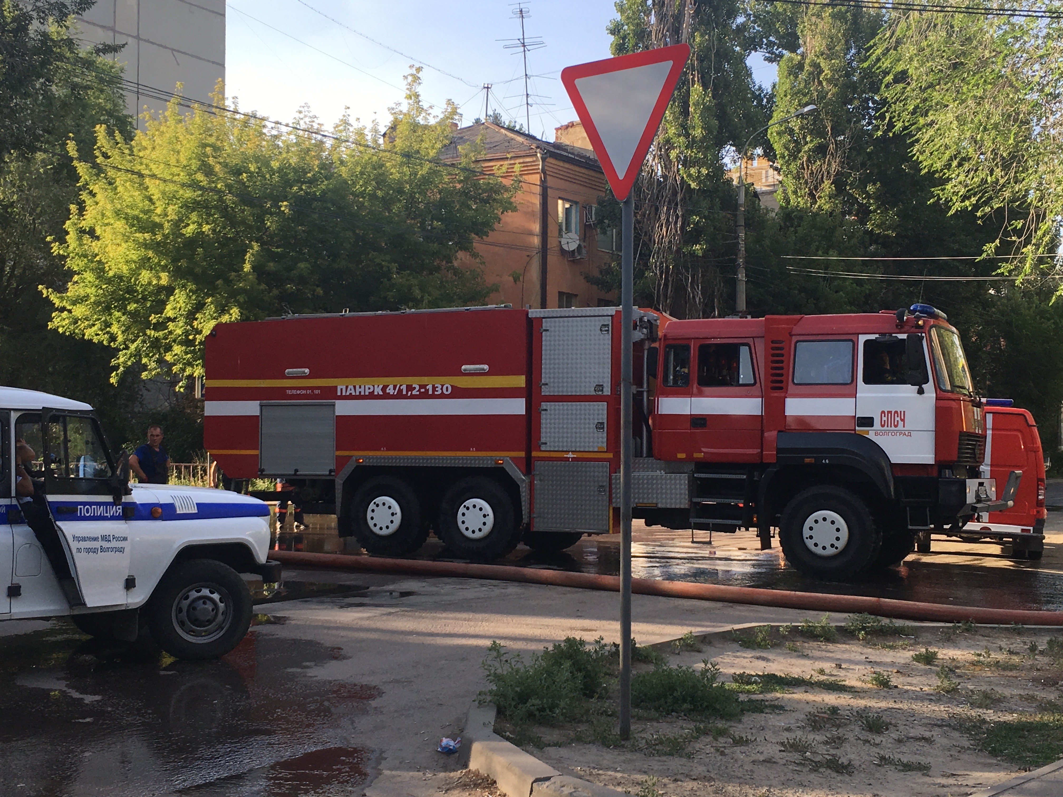 Вроде почти сбили огонь минут 20-30 назад. В этой длинной пожарной мандуле рукава, которые раскатали и подключились к воде недалеко от въезда в базу.