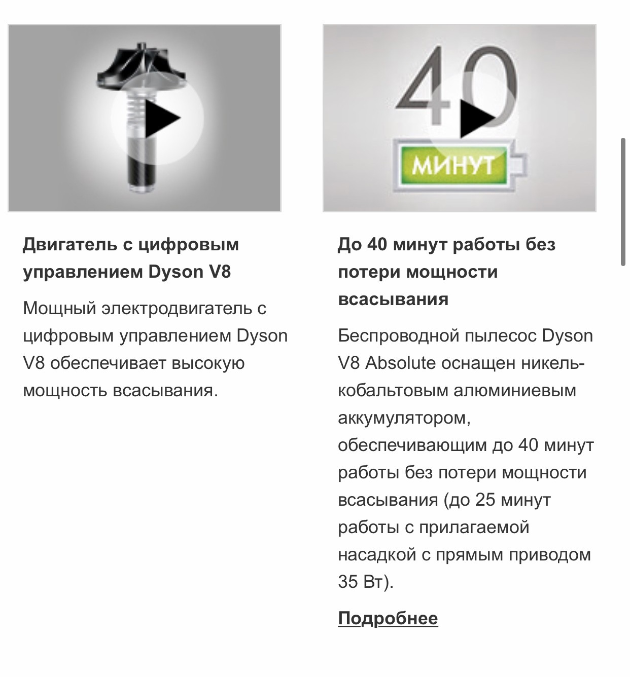 Пишу пишу) Только я пишу про ручной, в нём нет недостатков)) Первый Dyson dc35 мы купили очень давно, он работает до сих пор, меняли только аккумулятор. Альтернатива венику, быстро что-то убрать собрать, задумались об этом когда попугая приобрели и он линял). Пошли в магазин именно за ручным, маленьким автомобильным, но продавец, спасибо ему большое, уговорил на дайсон ручной. Следом, купили моющий Bissell 7700j, тоже супер автомат, и моется он тоже хорошо. Его пользовали по выходным, и пылесосили и мыли. Далее, как выше написано, накопила я денег и купила Dyson V8. Dyson V8. Да, он чуть потяжелее уже чем dc35, но и более совершенен. Работает уже 40 минут, с турбощеткой меньше. Колба сбора мусора больше, вытряхивается легко в унитаз, по мере необходимости моется легко и быстро. Есть режим увеличения мощности всасывания, иногда пользуюсь. Насадка для мебели, супер, стулья мягкие, матрасы - отлично вытаскивает пыль, фото найду, покажу. Пыль как мука в колбе. Тонкая началка, щели, плинтуса отлично. У меня в обиходе обычная стандартная началка, ежедневно беру в руки пылесос и не один раз за день. Иногда бегаю с турбощеткой. Воздух из него выходит чистый, ничего не воняет. Справляюсь держать его одной рукой вполне. Пробежавшись им по всей квартире, полы потом протираю, на тряпке мусора нет, вода чистая. Крошки, волосы, что-то рассыпал крупу, муку, дети поиграли, на подоконнике, под батареями, на мебели, и пыль и мусор какой-то и тд., жизни уже не представляю без этого пылесоса. Началка, насадка))