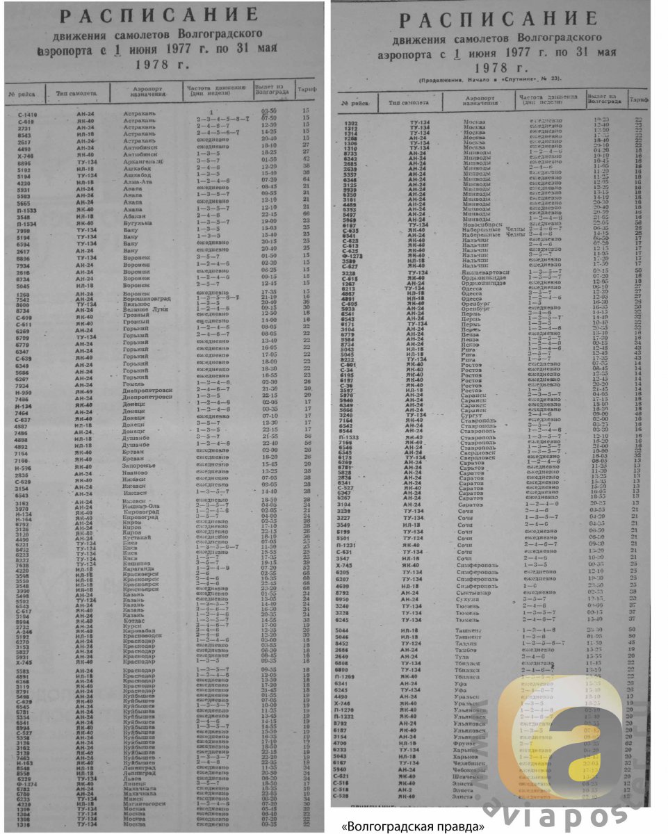 Там только кажется, что рейсов много. Реально 50% рейсов там челночное. Поэтому и получается так много перелетов. Если посмотреть, там очень много перелетов на Ан-24 и Як-40 Есть какой-то условный рейс Астрахань-Волгоград-Саратов-Нижний Новгород-Казань-Куйбышев (летит один самолет, просто с посадками) А в расписание это как пять рейсов (Волгоград-Астрахань, Волгоград-Саратов и Волгоград-Нижний Новгород Волгоград-Казань итд) Просто тогда были приняты такие челночные рейсы и очень многие рейсы по СССР были такие. Поэтому фактически рейсов было мало - а направлений в расписание - много. Почти все рейсы на Ан-24 из расписания - были такими (а их большая часть расписания) Так то и сейчас можно рейс Волгоград-Москва-Милан назвать единым и указать его в расписание Волгограда :Н)