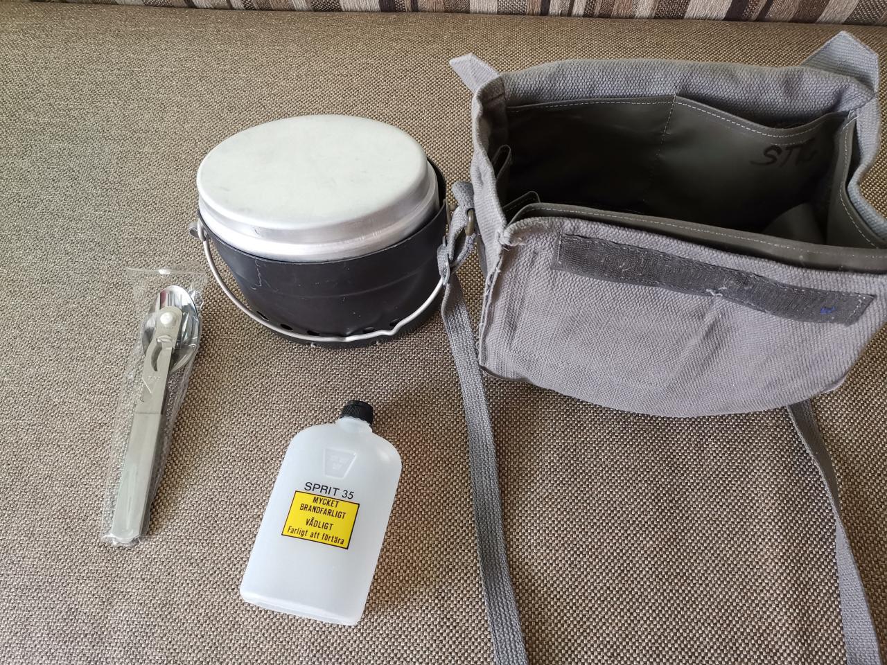 ШАК-39. Новый. Шведский армейский котелок в комплекте с ветрозащитным экраном, спиртовой горелкой емкостью для спирта. Котелок выполнен из алюминиевого сплава. Судя по тому что он не гнется с примесью железа. Дужки и крепления - стальные. Экран - сплав. Спиртовая горелка латунная. Емкость для топлива - пластик. крышка горелки с трещинкой, на функционал не влияет, но.. + к нему Набор столовых приборов Бундесвера. Оригинал. Новье, клейма BUND хочу 4 т.р.