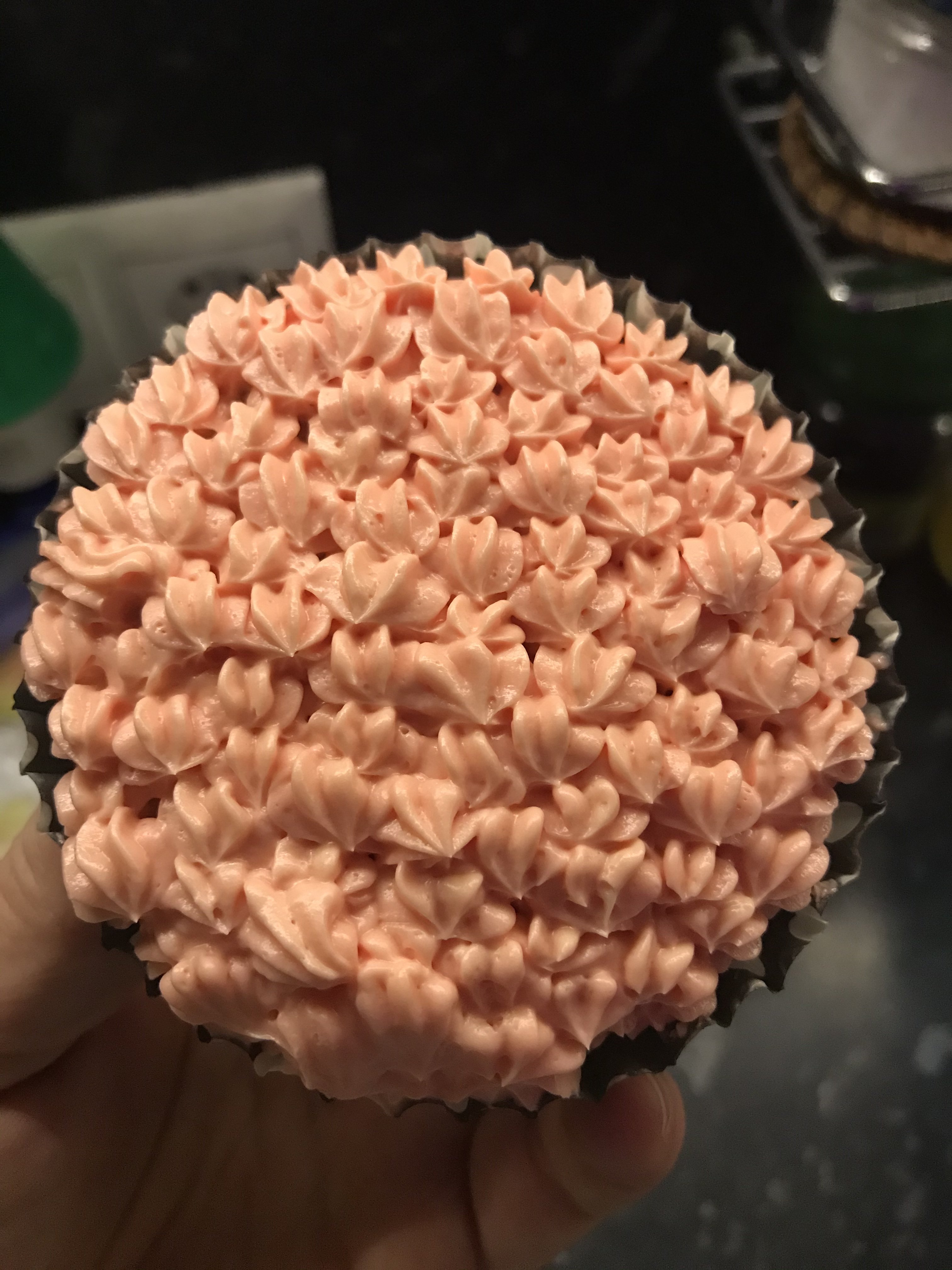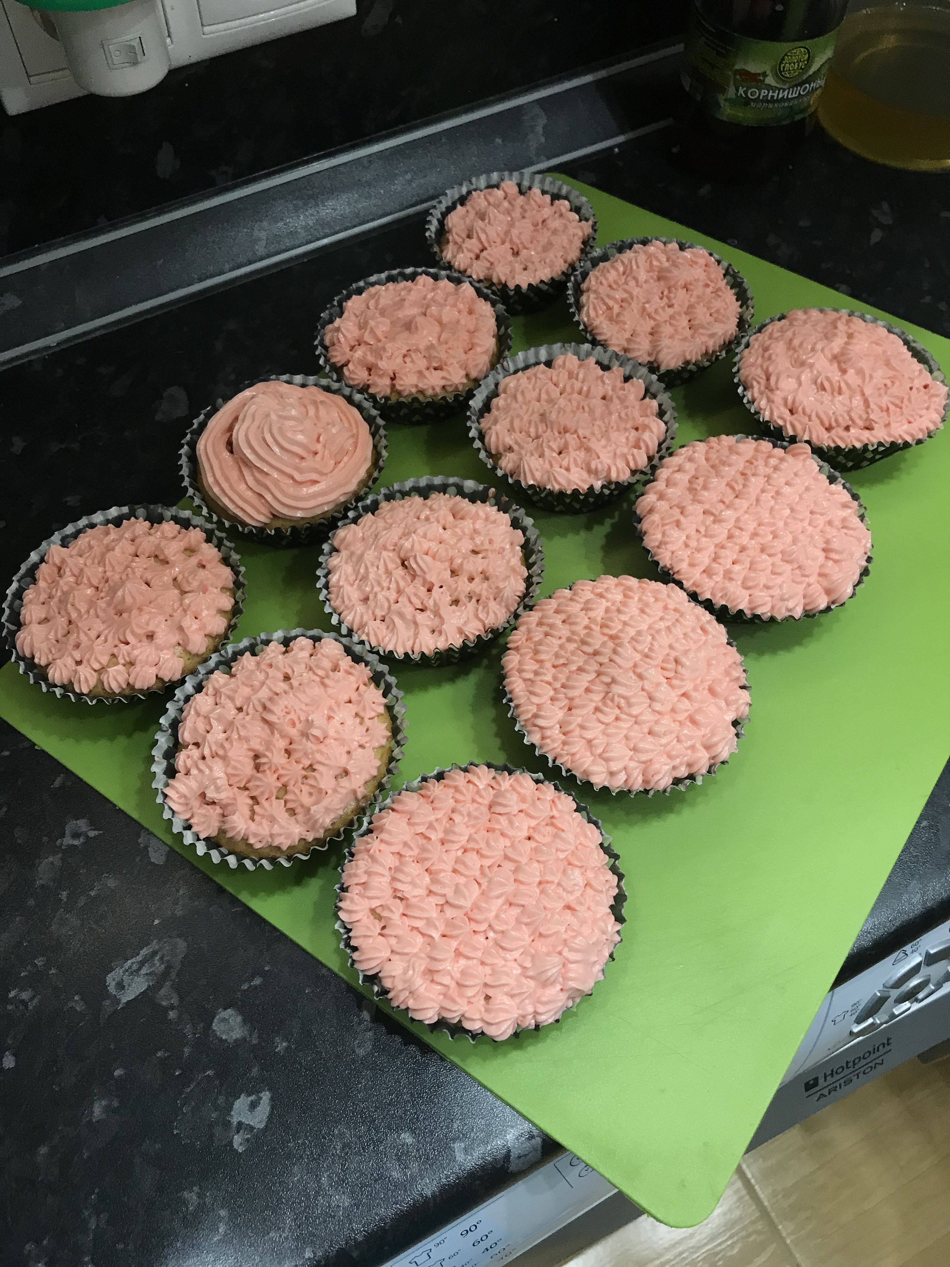Мои первые капкейки) Тесто Сливочное масло - 80 гр. Сахар - 100 гр. Ванильный сахар - 2 ст.л. Яйца - 2 шт. Молоко - 50 мл. Мука - 150 гр. Разрыхлитель - 1 ч.л. Соль - щепотка. Крем Сливочное масло - 200 гр. Сгущённое молоко - 100 гр. Краситель пищевой Ингредиенты комнатной температуры. Муку просеять, смешать с разрыхлителем и солью. Масло с сахаром и ванильным сахаром хорошо взбить, масса побелеет. Поочерёдно добавить яйца. Продолжая взбивать всыпаем половину муки, затем молоко, вторую половину муки. Тесто раскладываем по формам на 2/3 (чуть больше половины формы). Выпекаем в предварительно разогретой духовке до 170С в течении 20 минут. Крем: сливочное масло хорошо взбиваем в пышную массу, добавляем сгущенку и продолжаем хорошо взбивать. Украшаем как душе угодно)