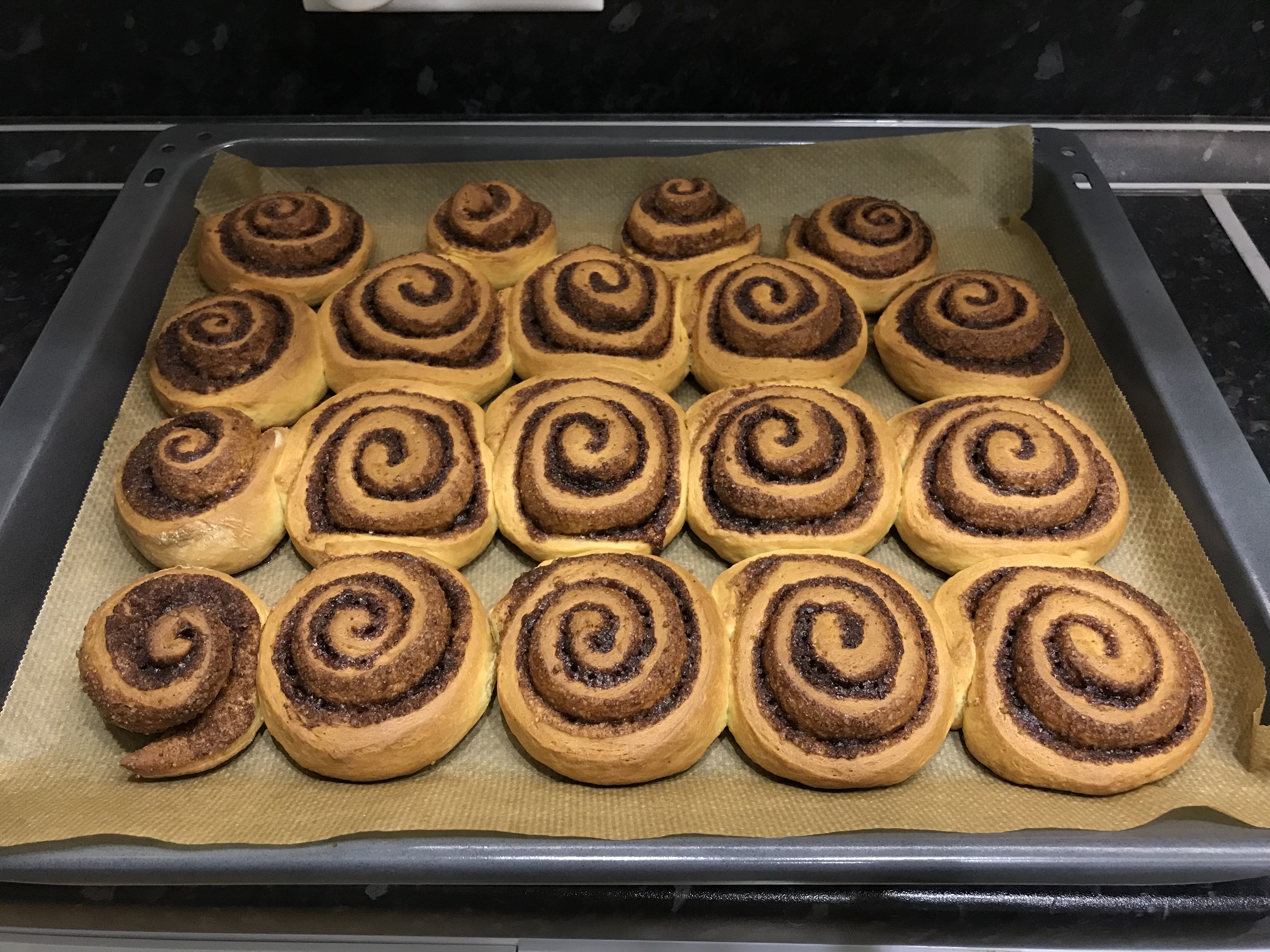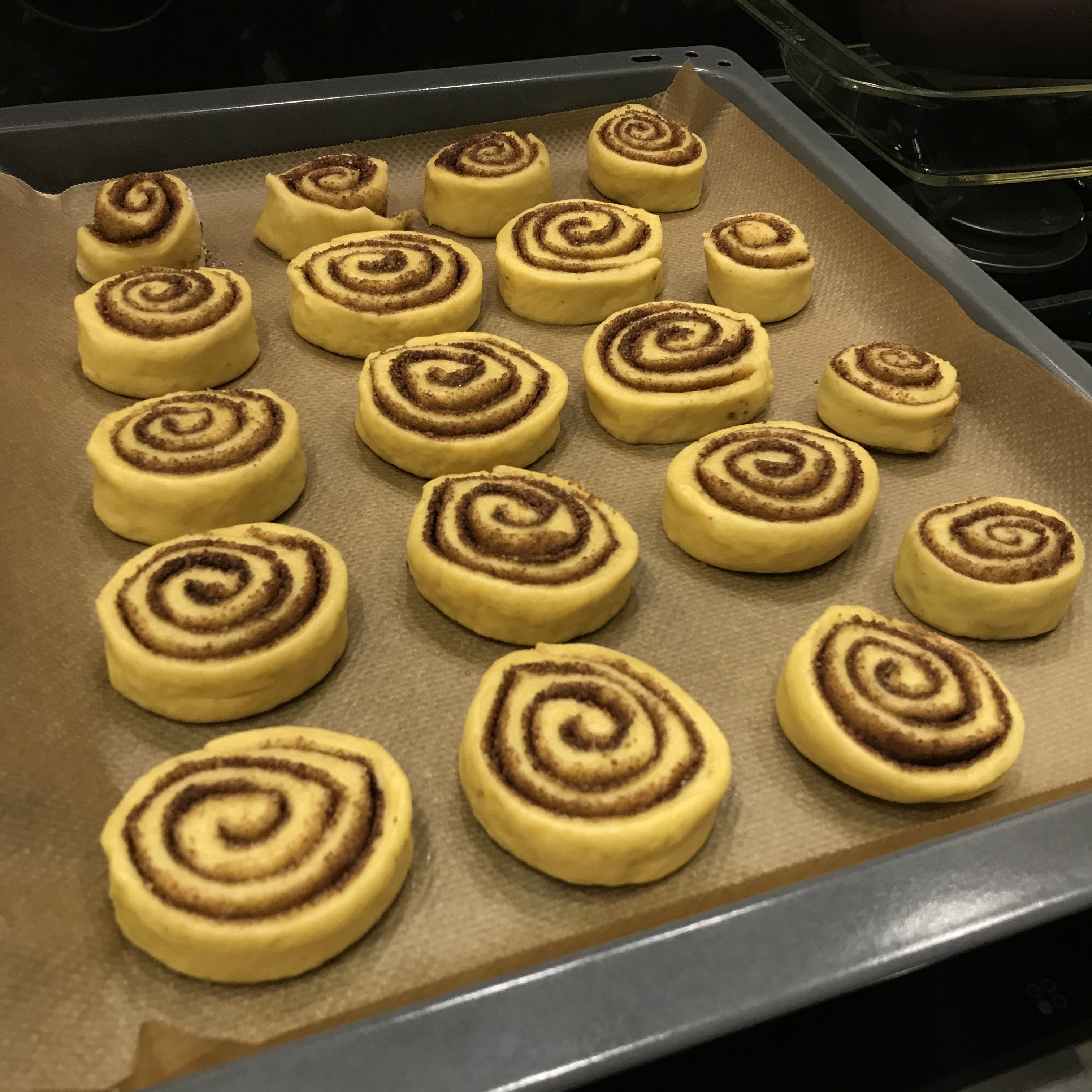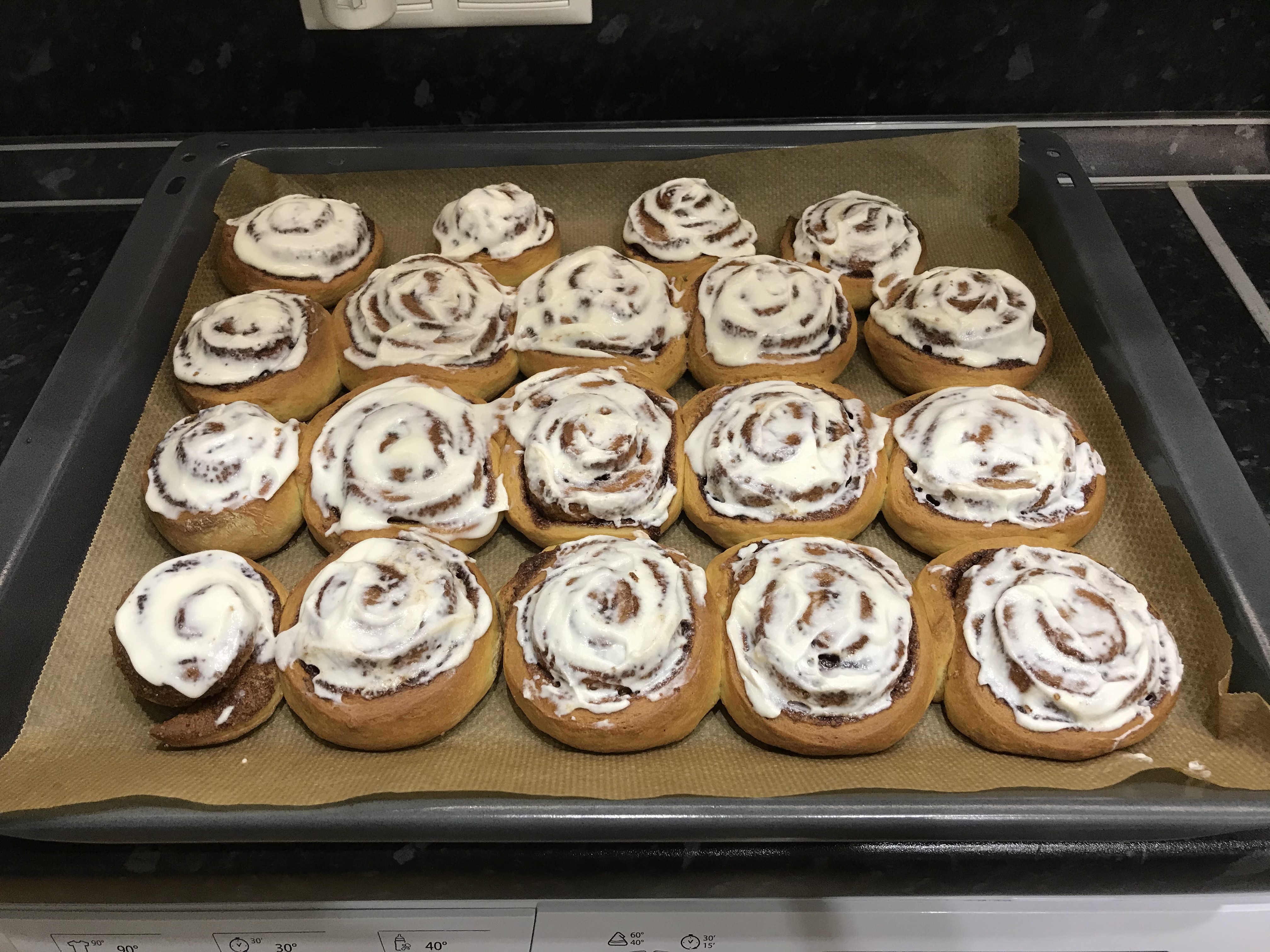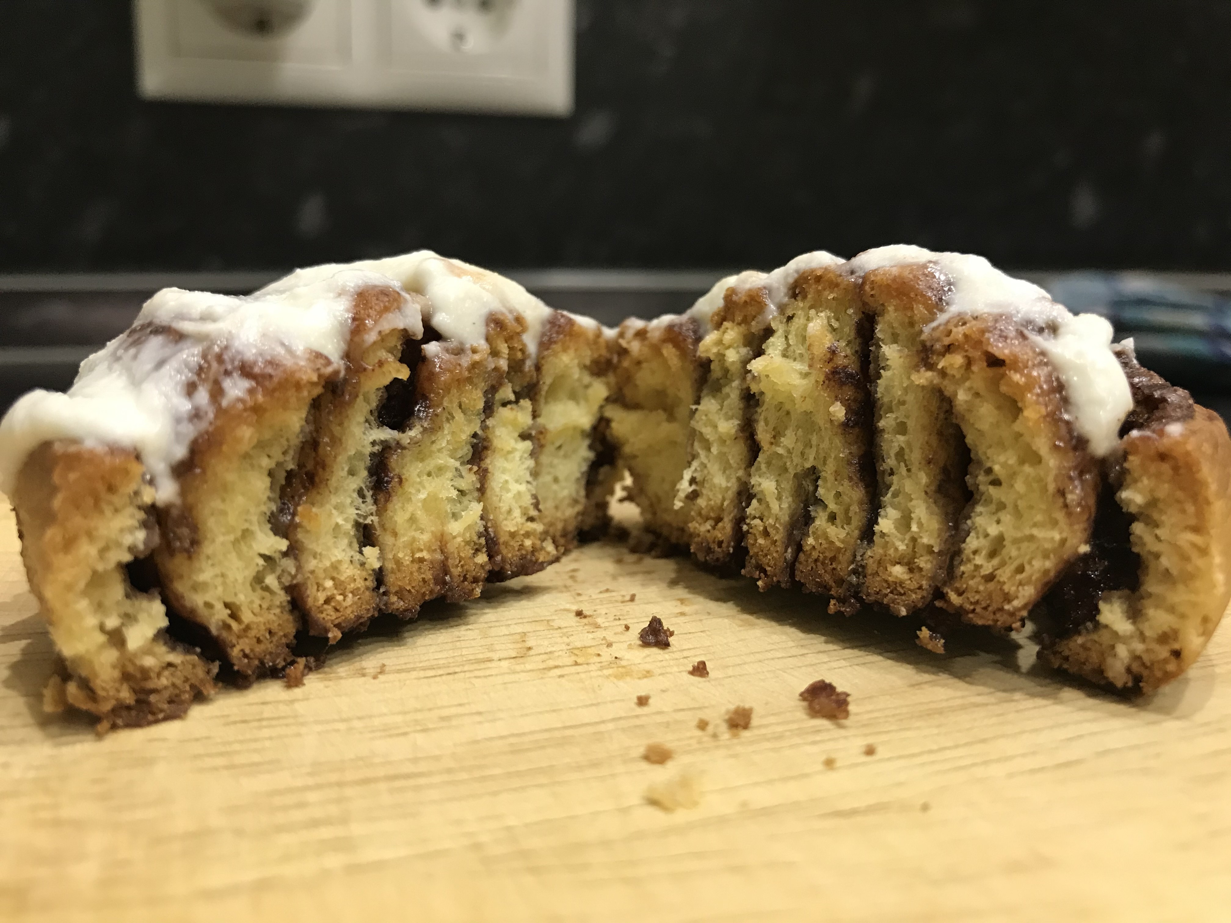 Я их сделала! Много лет не доходили до них руки Вкуснятина! Булочки Синнабон Тесто: Сливки 20% - 200 мл. Дрожжи сухие - 12 гр. (у меня Саф-Момент для сдобы) Сахар - 1 ч.л. Сливочное масло - 90 гр. Сахар - 100 гр. Яйцо - 3 шт. (1 целое и 2 только желток) Мука - 500-700 гр. (сколько возьмёт тесто, у меня ушло ~550гр) Соль - щепотка Начинка Сливочное масло - 50 гр. Сахар коричневый - 150 гр. Корица - 20-30 гр. Какао - 10-15 гр. Заливка Творожный сыр сливочный - 150-200-300 гр. (Mascarpone, Сырко, Almette, у меня был творожный Arla Natura) Сахарная пудра - по вкусу Молоко/сливки - до нужной консистенции Тёплые сливки вылить в емкость, добавить дрожжи и чайную ложку сахара. Перемешать и убрать в тёплое место минут на 10. Летом тепло, а зимой ставлю ближе к батареи. Сливочное масло комнатной температуры хорошо взбить с сахаром, добавлять по одному яйцо и желтки, взбить до однородной массы. Добавить эту массу в дрожжи и хорошо перемешать. Муку просеять с солью. Постепенно вводить в жидкие ингредиенты и замешать мягкое тесто. Оно получается мягкое, не липнет к пукам, гладкое, приятное. Накрыть полотенцем и убрать в тёплое место ~ на 1-1,5 часа. Должно подняться минимум вдвое. Раскатать тесто в прямоугольник, припылив мукой, до толщины 0,5 см. Смазываем тесто растопленным маслом, посыпаем смесью сахар, корица, какао. Сворачиваем в рулет, разрезаем на части. Выкладываем на противень, оставляя между булочками место, накрываем плёнкой и оставляем минут на 20-30. Отправляем в предварительно разогретую духовку до 180С и выпекаем 20-30 минут. Ориентир на готовность теста. Достаём и сразу смазываем/поливаем заливкой. Нюансы. Дрожжи могут быть готовы и раньше или чуть позже чем 10 минут. Также само тесто, ориентир на час-полтора, но чуть меньше больше может уйти времени. Когда работаю с дрожжевым тестом, исключаю сквозняк, не открываю окно и отличное настроение) Тесто можно поделить на две части, удобнее будет раскатывать, скручивать. Скручивать рулет в меру плотно. Моим хватило бы и 15 минут в духовке, я передержала. Заливки у меня на фото тоже мало, сделала из 150гр сыра, доп не стала замешивать. Но даже скромно покрытые заливкой они очень вкусные.
