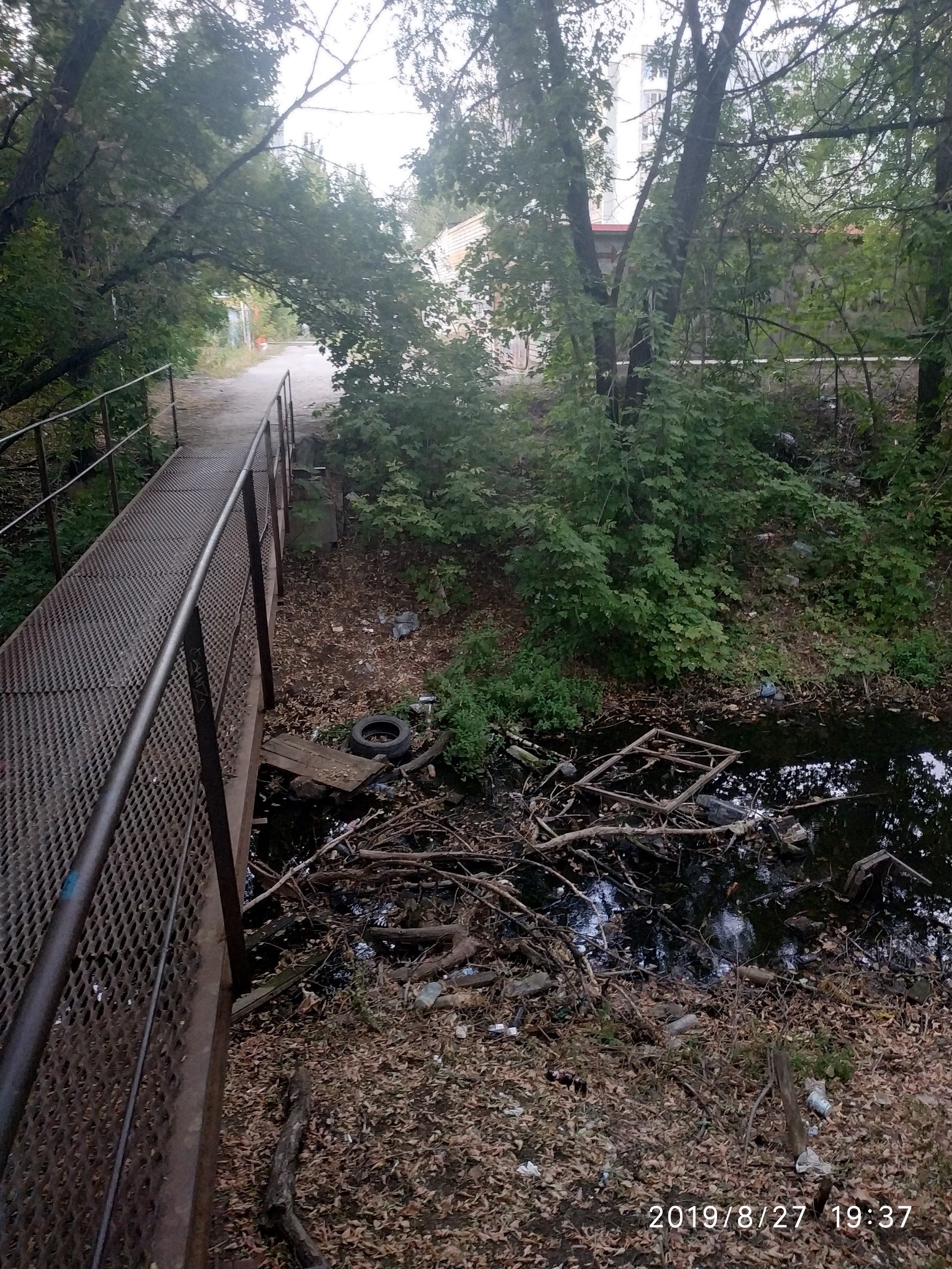 Вдоль железнодорожных путей в Красноармейском районе протекает небольшая речушка. В ней говорят живут лягушки, черепахи, утки. Я лично видел только лягушек и 3 уток. Во вторник вечером мы ходили осматривать эту речушку. Товарищи, это кошмар. Больше пластиковых бутылок я видел только на помойке. Мы обошли шесть мостков переходов через речку. Это примерно метров 200. Возле каждого полно мусора. В основном бутылки пэт, стеклянные бутылки, бытовой мусор. В речку сваливают все, от детской обуви, до оконных рам и метровых барабанов от промышленных кабелей. Куча спиленных веток на берегу. Причем судя по зарослям вдоль берега ветки пилили явно не здесь. Посреди речушки плавает пара детской обуви.