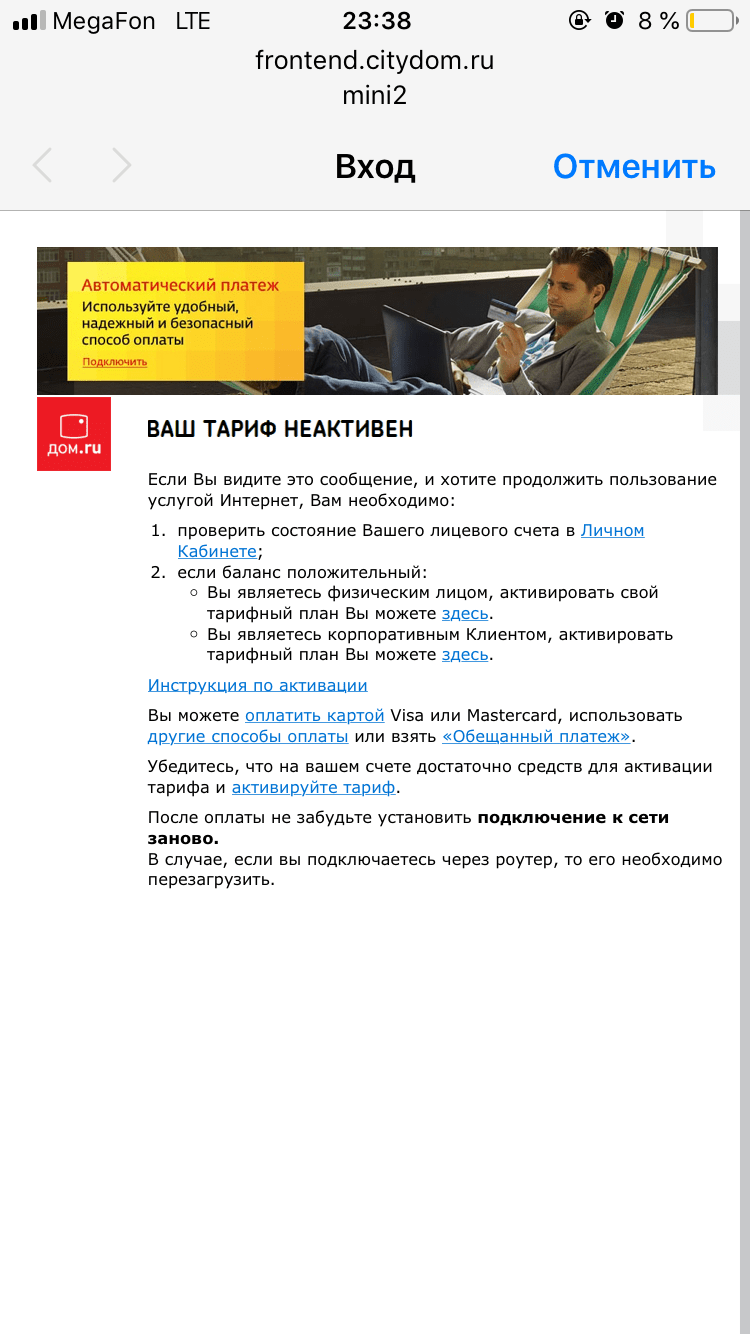 Раз ерунда вылезла значит устройство уже в сети, т. е. подключилось. Но вот дальше срабатывает переадресация на страницу-заглушку. Потому и предложили поменять DNS или напрямую по внутренним адресам обращаться, чтобы в пределах таблицы внутреннего коммутатора обмен данными шёл. Но тут может быть такой ещё вариант, что прошивка роутера блокирует любой обмен при не установленном wan соединении. А WAN линк отключается автоматом самим провайдером при недостаточности средств. Всё вышесказанное это догадки, потому как принцип работы с неактивными клиентами у Дом.Ру мне неизвестен