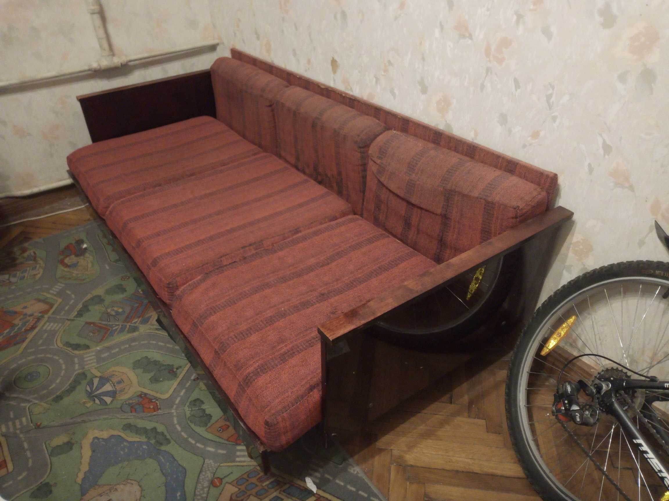 Побитый жизнью, но стойкий диванчик. Лежачее место (в нынешнем полувыдвинутом состоянии) 185х70. Если удастся выдвинуть полностью - будет 185х110. Поролон в подушках, как ни странно, не слежался и не рассыпается. Диван живёт на Комсомольской, 7 этаж, лифт. Если за пару дней не обретёт вторую жизнь на чьей-нибудь даче, во вторник отправится на свалку.