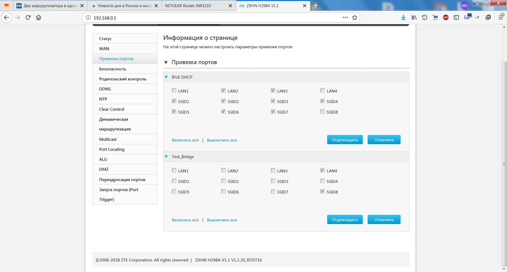 Всем добрый день. Ситуация следующая. Есть Netgear достаточно простой, работает по IPoE на Билайне. Вопросов к нему практически нет, за исключением одного - на данный момент 29 (да, не поленился, посчитал) сетей в диапазоне 2,4GHz (( Ну и сильно скачет скорость соответственно, сейчас я уже до 50 вроде снизил принудительно. Относительно стабильно теперь. Есть по случаю приобретенный для опытов провайдерский ZTE ZXHN H298A. Он может в 5GHz. Планировал на нем эту сеть поднять. И вот тут и начинаются для меня непонятки. Включаю один из ссидов, линкую его на созданное бриджевое соединение. Все работает. Но не очень долго . Однозначно заметил, что период работы сокращается при включении в этот же ссид сеть более одного устройства. Параллельно в ZTE сделал и соединение по DHCP. Залинковал на него другой ссид. Все, вроде бы ок, но устройства, подключенные к разным маршрутизаторам, получаются в разных сетях. Неудобно. Доступ к nas нужен отовсюду. Так что, великий разум ВФ, куда копать? Отключить DHCP на ZTE и все прописать руками? Лень. Мож что с бриджем не так сделал? Так там из настроек только vlan. Или бридж ни с чем вместе не живет? В общем, HELP!