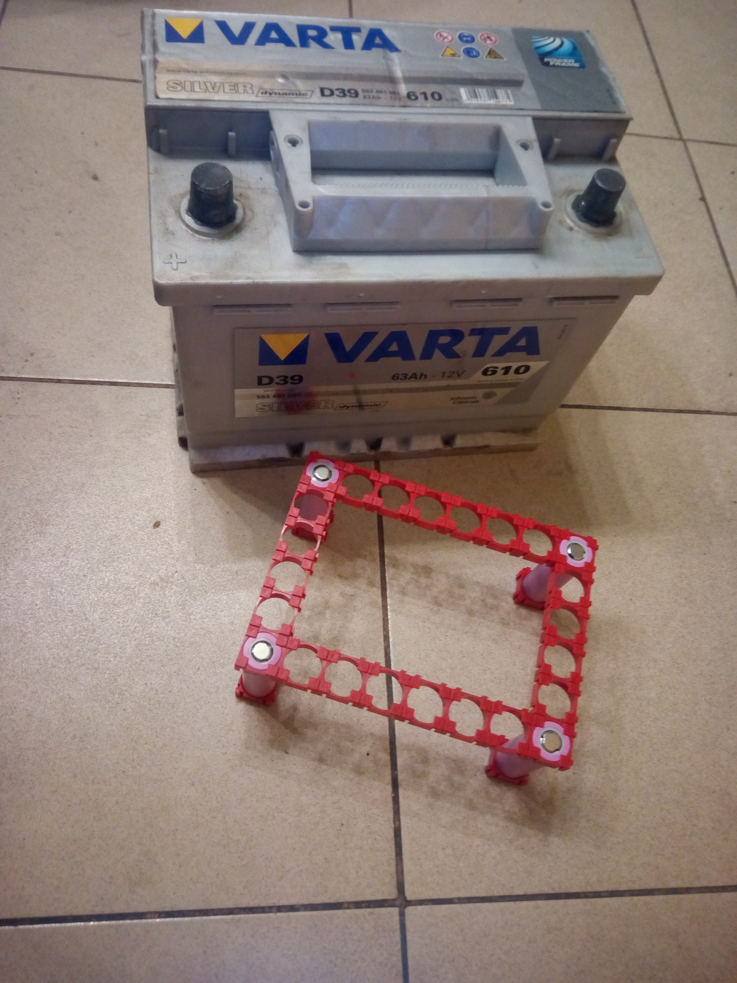Цену написал в личку. Параметры батареи: Батарея на 41,6Ач 3s16p банки EAIEP ICR18650-26F (18650) Сборка на пластиковых держателях, соединение контактной сваркой никелевой лентой. Компоновка 6*8 Вес батареи ~2,4кг. Размер 165*125*68мм (сделал фото макета с пластиковой картой для понимания размера) BMS "белая" настроенная на 3s Зарядка будет 5А, полная зарядка ~8,5 часов. По поводу банок eaiep 26f. Считаю их одними из самых приличных у китайцев сам на них катаю на электромопеде и доволен. Также на них собрал несколько электро велосипедов. В вашей же задаче банки будут работать в очень комфортом режиме. Ваш свинцовый стартерный АКБ на 55Ач весит ~15кг. Без вреда для АКБ снять с него можно только половину ёмкости. Сравнение со стартерной ВАЗовской батареей (55Ач размер тот же) Для примера выкладываю фото батареи велосипеда как примерно все будет выглядеть: