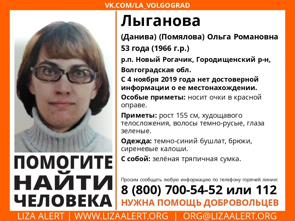 Поиски пропавшей в поселке Новый Рогачик Городищенского района 53-летней Ольги Лыгановой продолжаются третью неделю. Сведений о ее местонахождении нет с 4 ноября. В день исчезновения женщина Лыганова Ольга Романовна была одета в темно-синий бушлат, брюки и сиреневые калоши. При себе у нее была тряпичная зеленая сумка. Приметы разыскиваемой: рост 155 см, худощавого телосложения, глаза зеленые, волосы темно-русые. Из особых примет – носит очки в красной оправе. Всех, кому что-либо известно о судьбе разыскиваемой женщины, добровольцы просят позвонить по телефону: 8-800-700-54-52 или 112.