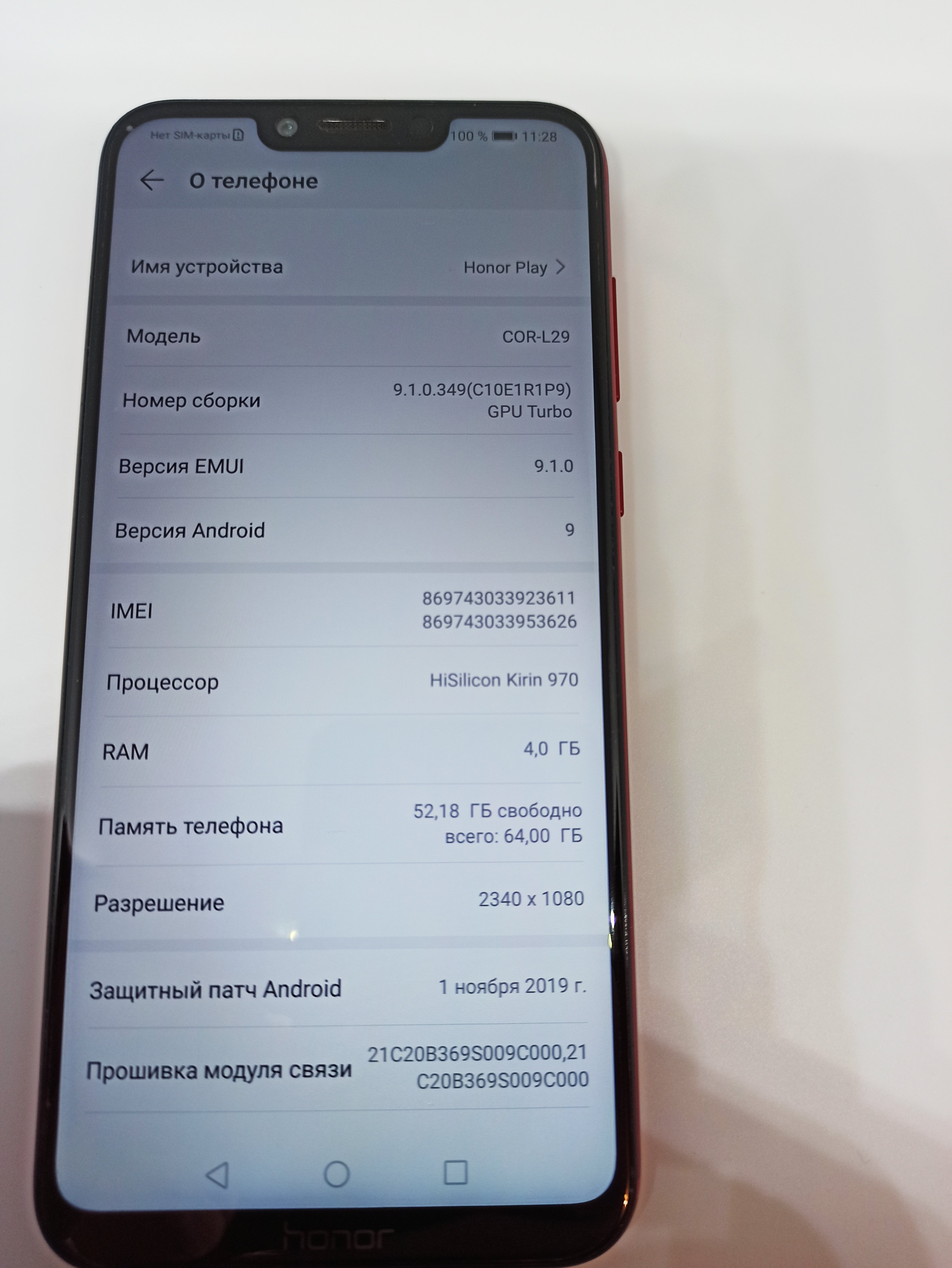 Продаю смартфон Honor Play (cor-l29), полностью рабочий, в хорошем состоянии, цвет красный, полный комплект, куплен в России. Плюсом три защитных чехла, наклеены защитные пленки (с олеофобкой) Характеристики: Дисплей: 6.3 дюйма, 2340х1080 Процессор: HiSilicon Kirin 970, графика Mali-G72 MP12 Память: 4 ГБ ОЗУ, 64 ГБ встроенной памяти, microSD до 256 ГБ Аккумулятор: 3750 мАч, быстрая зарядка Основная камера: 16 МП + 2 МП Wi-Fi 802.11ac, Bluetooth 4.2, USB Type-C, NFC, GPS/ГЛОНАСС Android 9, EMUI 9.1.0 Смартфон эксплуатировался аккуратно, в чехле, спереди и сзади наклеены гидрогелевые пленки с олеофобным покрытием. По состоянию: на стекле есть мелкая царапинка, под пленкой практически незаметная, пара едва заметных коцек краски на корпусе, технически полностью исправен, все работает. Приобретен в России. Комплект: оригинальный комплект, плюс 3 защитных чехла. Обмен не интересен, только продажа.