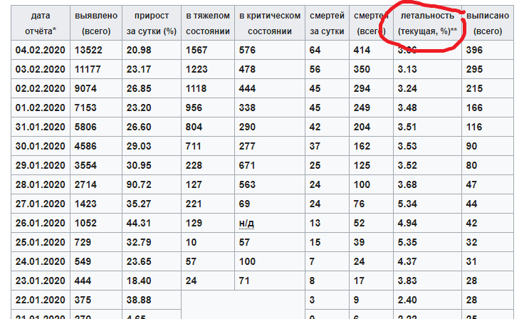 Как «интересно» пытаются гасить панику ))) - от только что заболевших быстро пересчитывают процент смертности, получается все ниже и ниже ))) успокаивающие заголовки: «китайце посчитали, что смертность всего 2 процента», в статье «это вам не то что грипп (смертность 0,05%) или эбола (при высокой смертности болеют всего тысяч 6 человек ))) интересно, при гриппе обычном каждый год такую панику чего не поднимают, это ж мировая пандемия)))) Никакие там не 2%. Отсчитала статистику на 5 дней назад. Те, кто уже болел тогда и умер на сегодняшний день - 5%.
