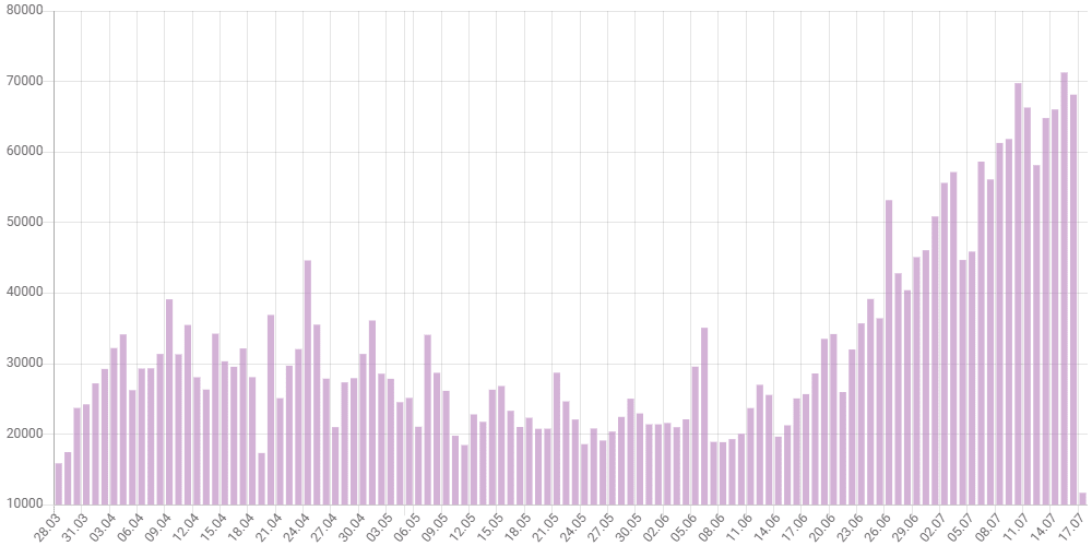 Многие страны сейчас занижают статистику. Кто-то тупо проводит мало тестов, кто-то списывает ковид на другие болезни. Кому-то это надо в политических целях, кому-то в экономических, а кому-то и в тех и в других. ИМХО наиболее адекватная статистика сейчас в США. По которой видно, что болячка отступать даже не собирается. Динамика новых случаев.