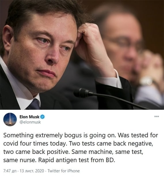 Илон Маск сдал 4 теста на COVID-19 в один день, и... получил разные результаты. «Происходит какая-то чушь. Сегодня тестировался на COVID четыре раза. Результаты двух тестов пришли отрицательные, двух – положительные. Одно и то же оборудование, один и тот же тест, одна и та же медсестра. Экспресс-тест на антигены от BD (американский производитель тестов)», — написал Маск в Twitter.