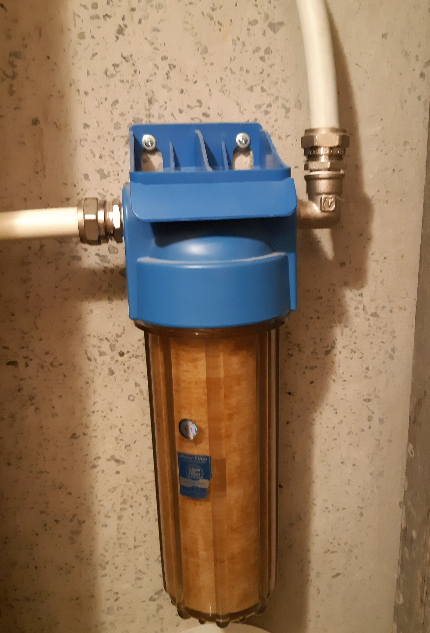 Обычная колба (в Леруа или Оби) + фильтрующий элемент (в Леруа дешевле всего). Замена занимает около 5 минут. Планирую поставить то же самое еще и на горячую воду (увидел, что есть аналогичные колбы для воды до 80 градусов). Кстати - результат работы фильтра за 1 неделю (был кристально белый): Фильтрующий элемент - 90-100 мкм. Промывка может быть затруднительной. Я такой вариант отверг.