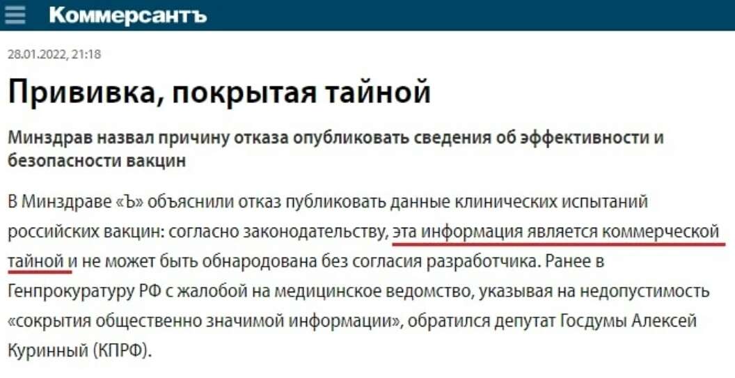а что непонятно? в запросе потроха исследования. почему бы в потрохах не быть коммерческой тайне?между прочим, если в Педе изобретут методику обучения во сне, и оформят ноу-хау(3 дня со сбором подписей), то она тоже превратится в коммерческую тайну. И результаты опубликовать будет можно, а потроха-нет. и кстати вот пример тут вообще АО участвует) Государство дает деньги иногда такими способами... да нет там запрета на публикацию вообще. Там запрос на ПРОТОКОЛ. Это потроха, они не нужны в публикациях. вокруг эпивака такой шухер, что аж на Северинова льют заказные помои ему что помощники приперли в распечатке, то он и говорит а помощникам кто данные дает? блин, скока народу надо пересажать... @limon, вы кстати самое интересное не процитировали Зампред комитета Госдумы по охране здоровья, хирург Алексей Куринный подал обращение в Генпрокуратуру РФ о незаконности сокрытия общественно значимой информации Минздравом России, связанной со здоровьем и жизнью граждан. Господин Куринный направил в медицинское ведомство запрос о предоставлении результатов клинических исследований вакцины «Спутник V». Минздрав отказал, объяснив, что эти результаты «являются конфиденциальными и содержат информацию, составляющую коммерческую тайну». В медицинском ведомстве «Ъ» объяснили такую позицию нормами федерального закона №61 о государственном регулировании обращения лекарственных средств. В соответствии со ст. 18 регистрационное досье на лекарственный препарат для медицинского применения представляется заявителем в Минздрав России в форме документа, включающего в себя в том числе отчеты о результатах клинических исследований. «Документы и данные, входящие в состав регистрационного досье, содержат конфиденциальную информацию, относящуюся к коммерческой тайне, в связи с чем не могут быть предоставлены третьим лицам без согласия разработчика»,— указано в ответе Минздрава. Разработчиком является Центр имени Гамалеи, подведомственный медицинскому ведомству. В министерстве добавили, что законом не допускается использование в коммерческих целях информации о результатах доклинических и клинических исследований без согласия производителя в течение шести лет с даты государственной регистрации. «Следует отметить, что в соответствии с принятой международной практикой данные регистрационного досье остаются конфиденциальными, и решение публикации результатов клинических исследований лекарственных препаратов в научной прессе принимается разработчиком лекарственного препарата»,— заявили в Минздраве, уточнив, что результаты клинических исследований «Спутника V» опубликованы в отечественной и зарубежной научной прессе, в том числе в журнале The Lancet. В феврале 2021 года, отметим, в упомянутом издании были опубликованы промежуточные итоги третьей фазы клинических испытаний препарата. «Данные клинических исследований должны быть опубликованы,— настаивает в беседе с “Ъ” Алексей Куринный.— Более того, текущую статистику, связанную с эффективностью и безопасностью вакцины, тоже не публикуют. Это практика многих стран, в том числе тех, которые используют нашу вакцину, например, Венгрии и Аргентины. Российские власти делать этого почему-то категорически не хотят». По мнению парламентария, в случае публикации данных доверие к вакцине и в целом к пр