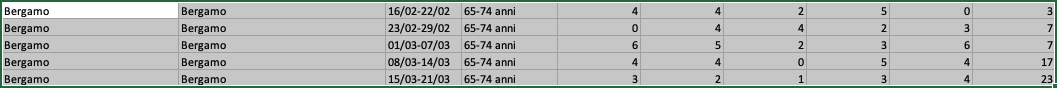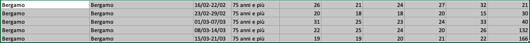 Мне тоже стало интересно, оказывается итальянский госстат выложил статистику по смертям в Италии по каждому муниципалитету с 01.01 по 21.03 за последние 5 лет. С начала марта смертность в Италии увеличилась в 2 раза, а например в Бергамо в 4 раза. В маленьких городках смертность увеличилась вплоть до 10 раз. Вот тут экселька, если интересно: Istat during the Covid-19 emergency А вот так выглядит смертность 2015-2020 в Бергамо:
