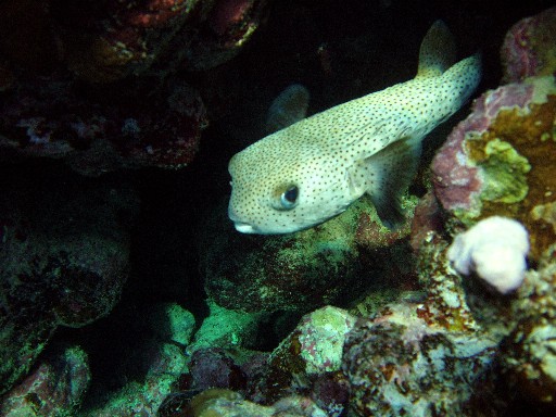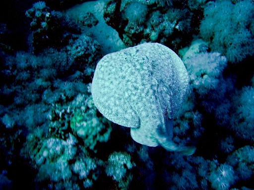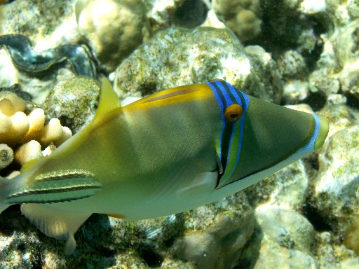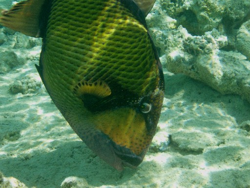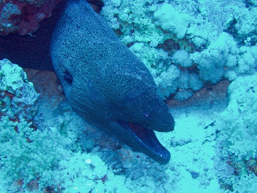 А эта рыба очень агрессивная! Нападала на инструктора по дайвингу, когда они плавали с мужем. Прокусила ласту как компостером. Ее размер в длину около метра и очень приличные зубы.