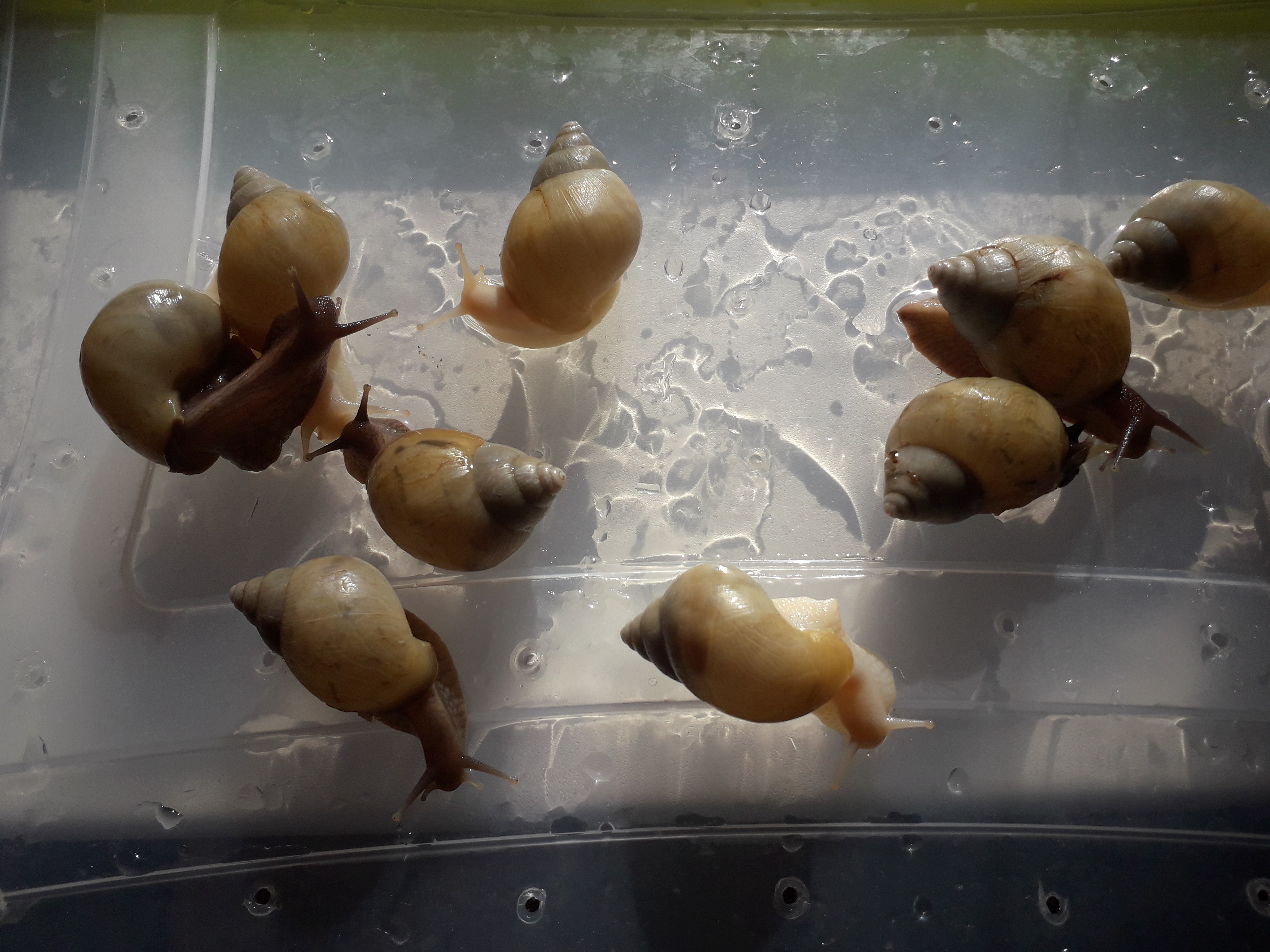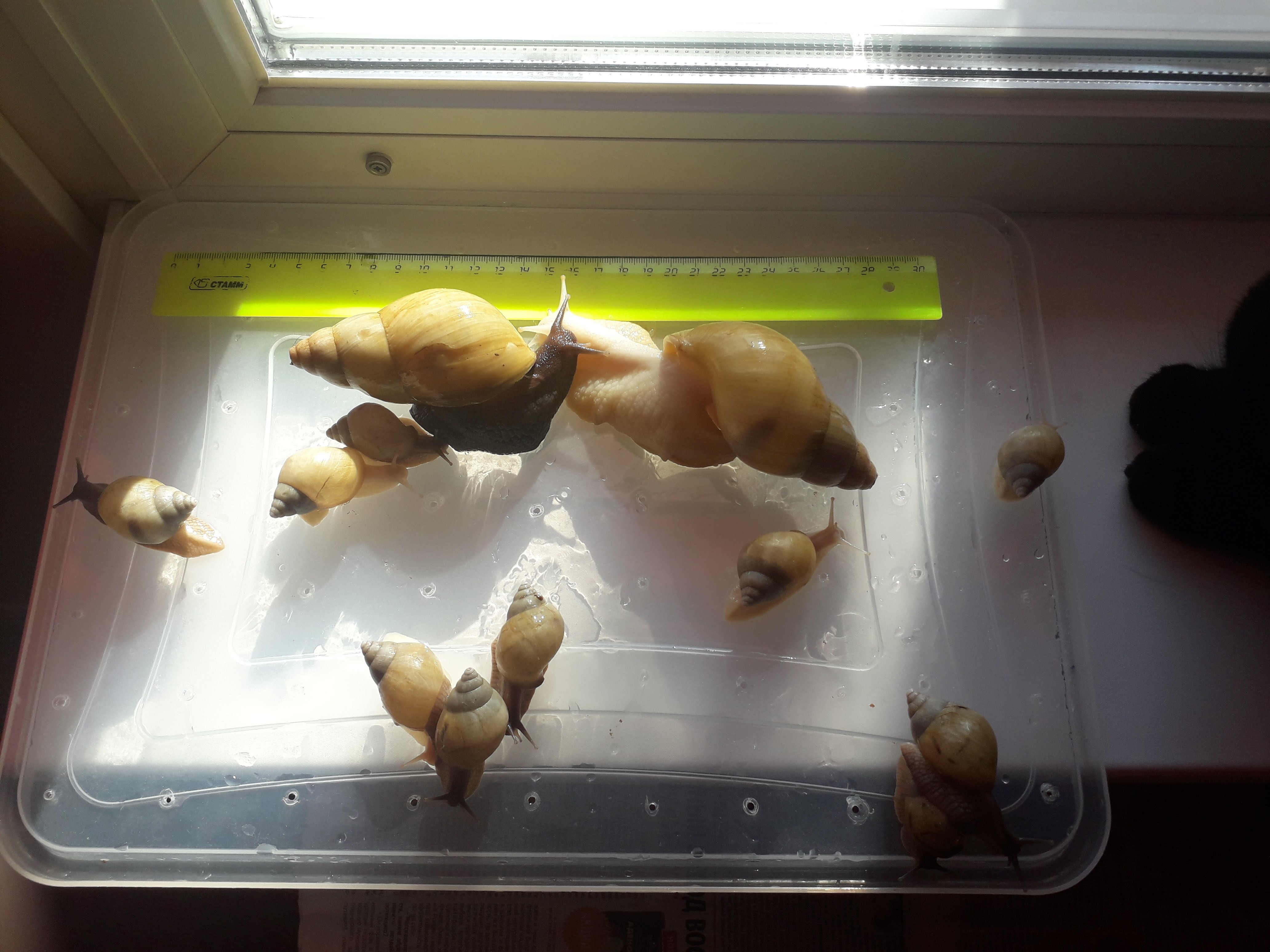Улитки уже подросшие - на начало мая 2020 раковина 4-6 см., возраст 5 месяцев. При правильном уходе вырастут минимум втрое. Подробно с деталями рациона, содержания и прочее можно ознакомиться в Интернете.