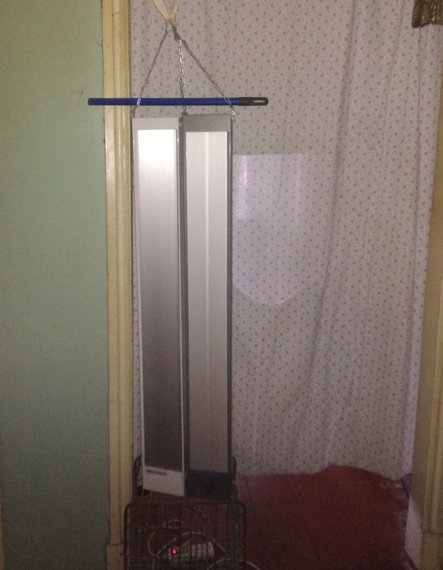 Объем считать надо, мне лень. :) Где-то 20+ площадь, две комнатки с общим коридором, потолки высокие, 280 см. Обогреватели стояли в коридоре и «светили» в дверные проемы комнат. На скорую подвесил «за химо» с опорой на старый железный ящик для молочных бутылок.