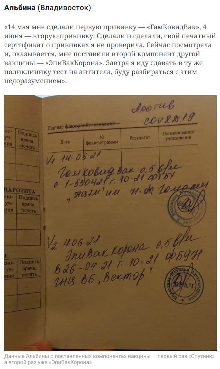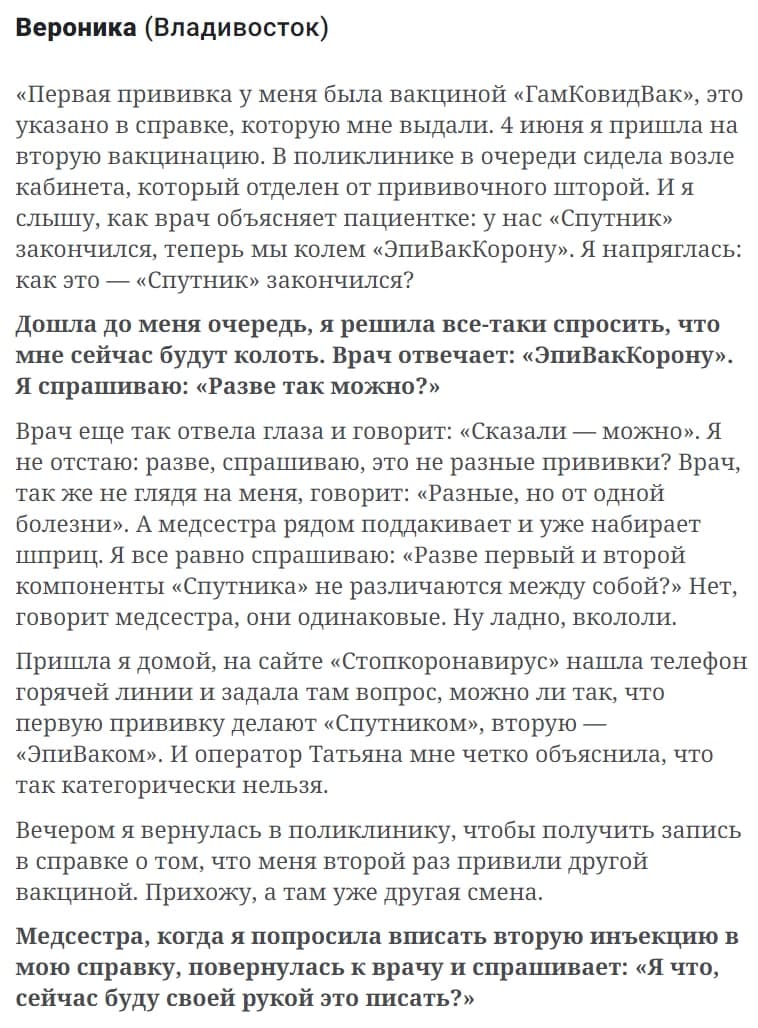 Новая газета - Novayagazeta.ru "ЭпиВакАфера В прививочных кабинетах начали заменять вакцину «Спутник» препаратом «ЭпиВакКорона», не предупреждая пациентов Добровольно-принудительная вакцинация, судя по рассказам пациентов и врачей, в России негласно началась. Об этом говорят люди, которые пришли в прививочные кабинеты добровольно, но там вместо выбранной вакцины получили «ЭпиВакКорону». С вопросом «Что теперь делать?» они обратились в группу добровольцев — исследователей вакцины, а потом некоторые из них рассказали свои истории «Новой». Нам известны их имена, рассказы они подтвердили бумагами, многие готовы идти в суды, считая, что их здоровью мог быть нанесен ущерб. Поэтому мы не просто поговорили с ними, но и попросили юриста прокомментировать ситуацию."
