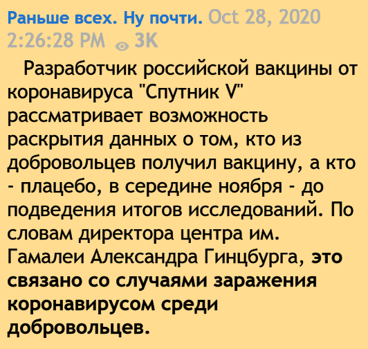 Вообще, странно, что нет никаких сливов положительных новостей про третий этап тестирования. Ведь на протяжении всей этой истории с вакицоной все положительные новости сливались на всех уровнях сраз. Вакцину сделали. Она безопасна. Точно появляются антитела. Это всё сразу рассказывалось до официальных результатов и публикаций. Но сейчас нет таких сливов типа "никто из получивших вакцину не заболел". Или хотя бы "заболевших среди получивших плацебо в разы больше, чем тех, кто с вакциной".