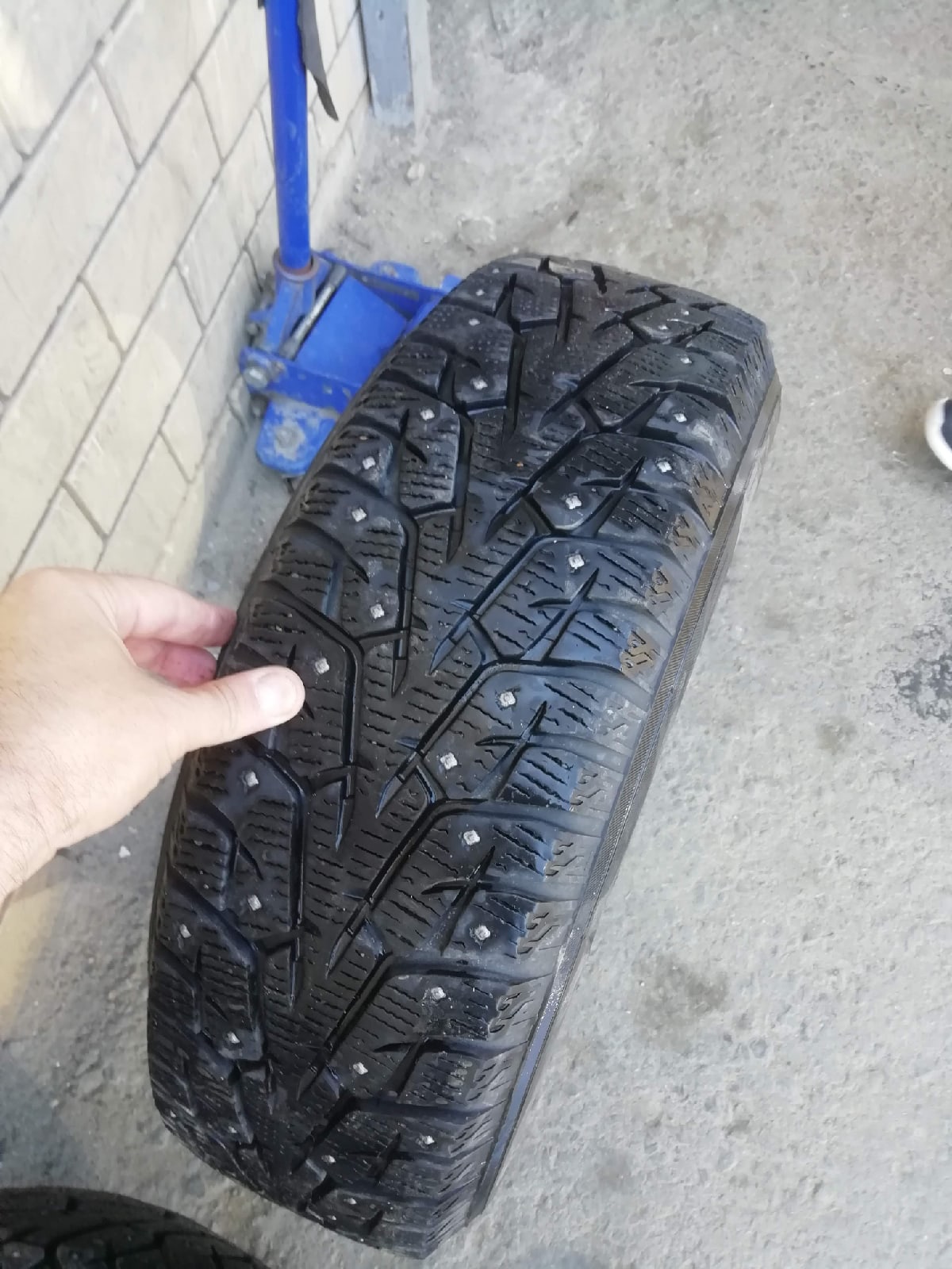 Пробег 3 сезона (покупал новыми осенью 17 года). Производство - 22 неделя 2017 года. На одной шине латка. Шипы на месте (родные). Цена - 6000 р (за 4 шт).