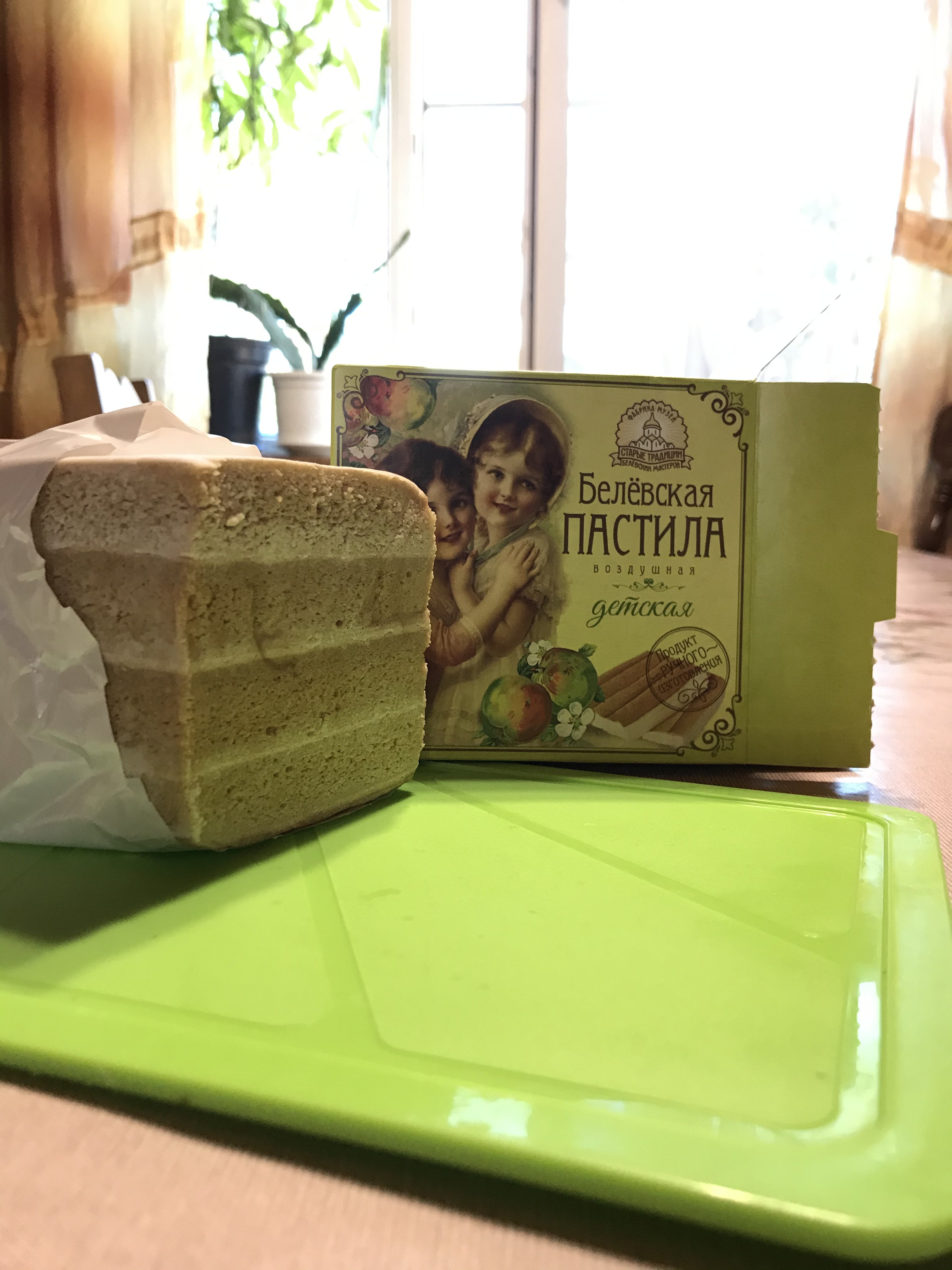 Белёвская пастила. При покупке, обращайте внимание на производителя. На слуху слово «белёвская» которое и написано большими буквами, увидев его, берём пастилу, её же, белёвскую, все хвалят. Идём радостные домой, кусаем и тут фиаско, кислятина!)) А почему? Потому что, есть разные производители и вкус разный. Вкусная у производителя «Старые традиции» мои фото на столе. У бренда «Традиции Белёва» пастила кислая бррр, фото прямоугольной коробки.
