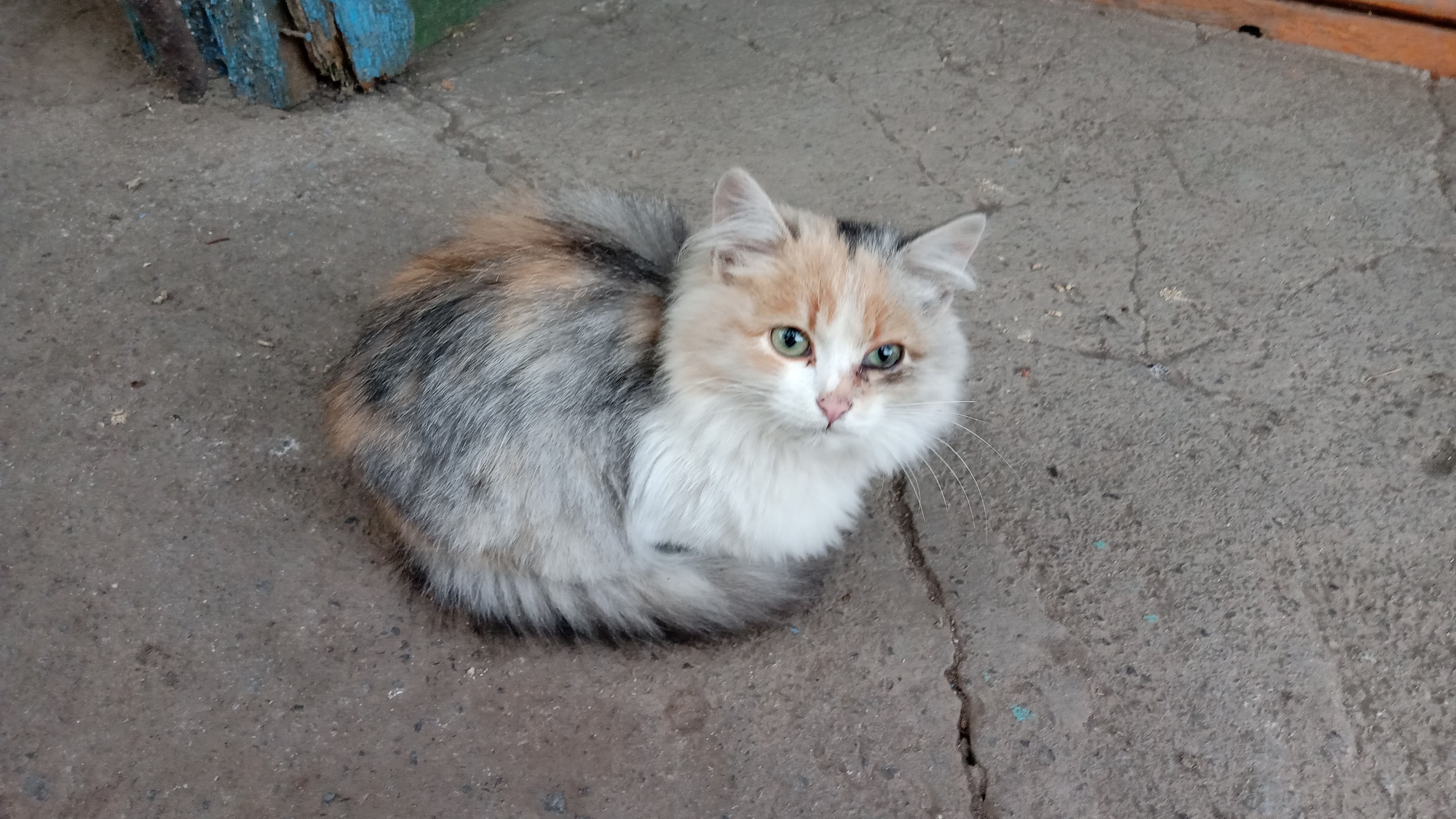 Трехцветная деревенская кошечка. С возрастом затрудняюсь, по размерам 0,5 взрослой кошки. Хозяйка умерла, ищем новую. Актуально сегодня до 15:00.