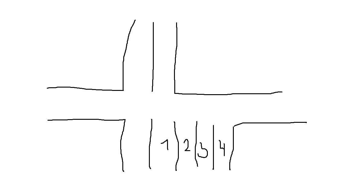 Потому что пересечение траекторий с другими авто получается, а значит аварийная ситуация. Место на островке надо занимать так, чтобы траектории не пересекались. То есть 1 в левый ряд идёт. 4 в правый или на парковку. Иначе аварийная ситуация.