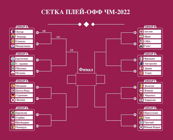 Если без сенсаций, то 1/4 финала огонь. Нидерланды-Аргентина Испания-Бразилия Англия-Франция В группах F и H пока вообще всё не ясно. Пусть будет Хорватия/Уругвай и Португалия/Бельгия ))