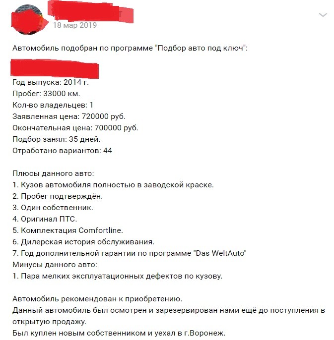 Да, согласен - но подборщики реальное хорошие, всегда им доверяю. Ниже вот пример - отчета по последнему приобретенному у них авто - можете убедиться - в марте 2019, куплен авто 2014 года - с пробегом 33 000 км. Название подбора замазал. Сейчас на данном авто - пробег 51000 км. Цена нового в марте 2019 - была 1,2 млн. А цена этого авто на текущий момент на вторичке - от 800, т.е. я еще и в плюсе. И самое главное по этому авто - гарантию дополнительную на год DWA - диллер дает только при 100% уверенности в автомобиле, его пробеге, истории обслуживания. Этот авто обслуживался постоянно у них, владелица была постоянной клиенткой.