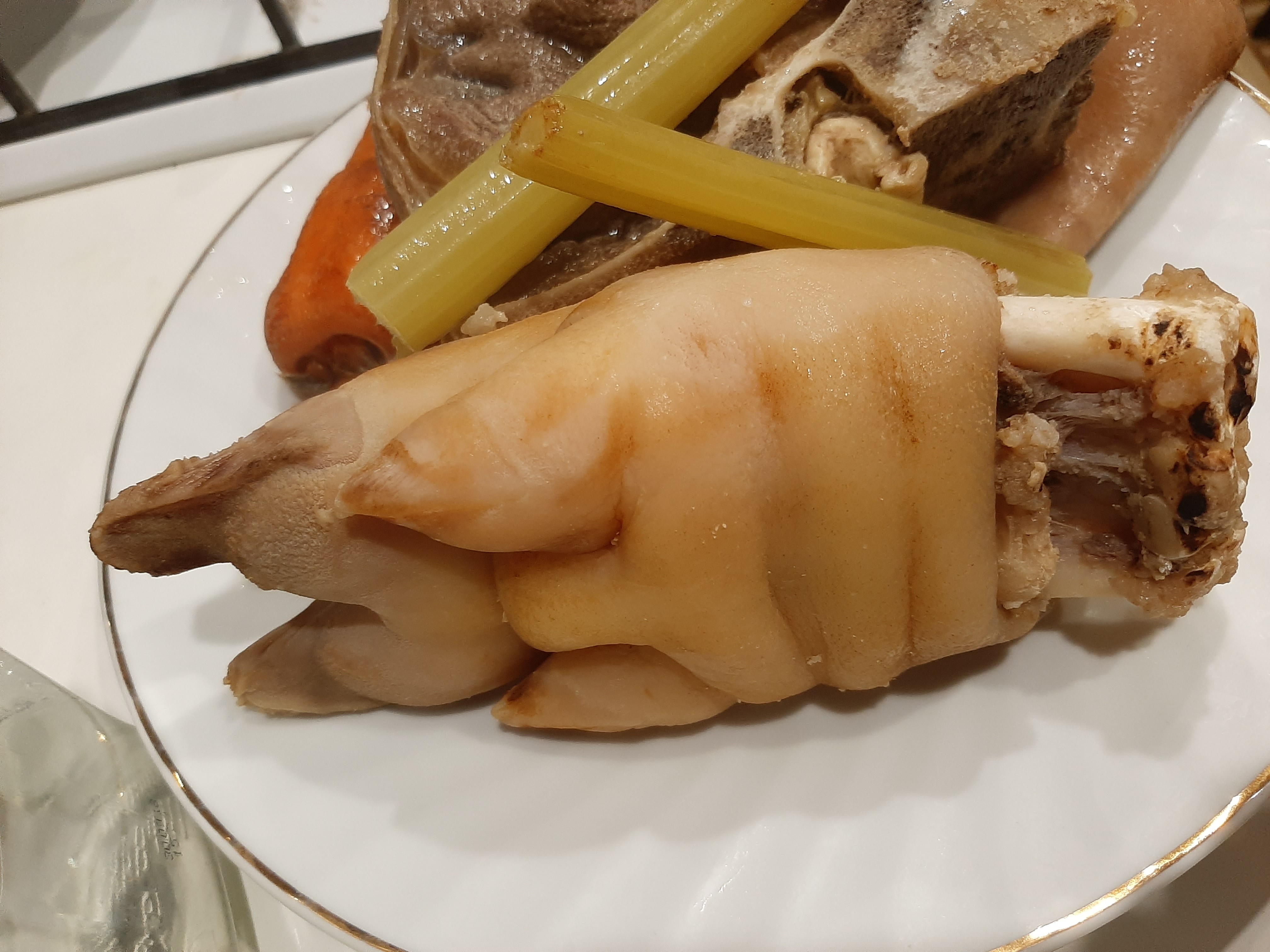 В ночь варил холодец, так как прошлогодний уже закончился. Две свиные ноги - копыта с ногой и рулька. Плюсом куриная грудка. По просьбам желающих. Предыдущий варил с копчиком ещё - неплохо вышло, спинной мозг добавил навар. Варю не менее 12 часов. Не понимаю как можно сварить за 6 как во многих рецептах указывают. желатин не добавляю - не зачем. Подсаливаю, специи/овощи по вкусу и настроению.