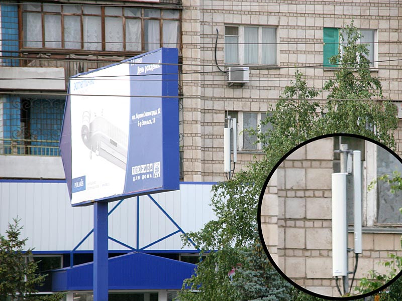 Вот еще две "подружки". Та, которая слева, направлена на дом с "Эльдорадо". Он, в принципе, далеко. Тут тоже можно жить спокойно. А вот правая антенна направлена параллельно дому. Т.к. в горизонтальной плоскости диаграмма направленности составляет 60 градусов, то я бы жителям 2-3-х этажей не позавидовал.