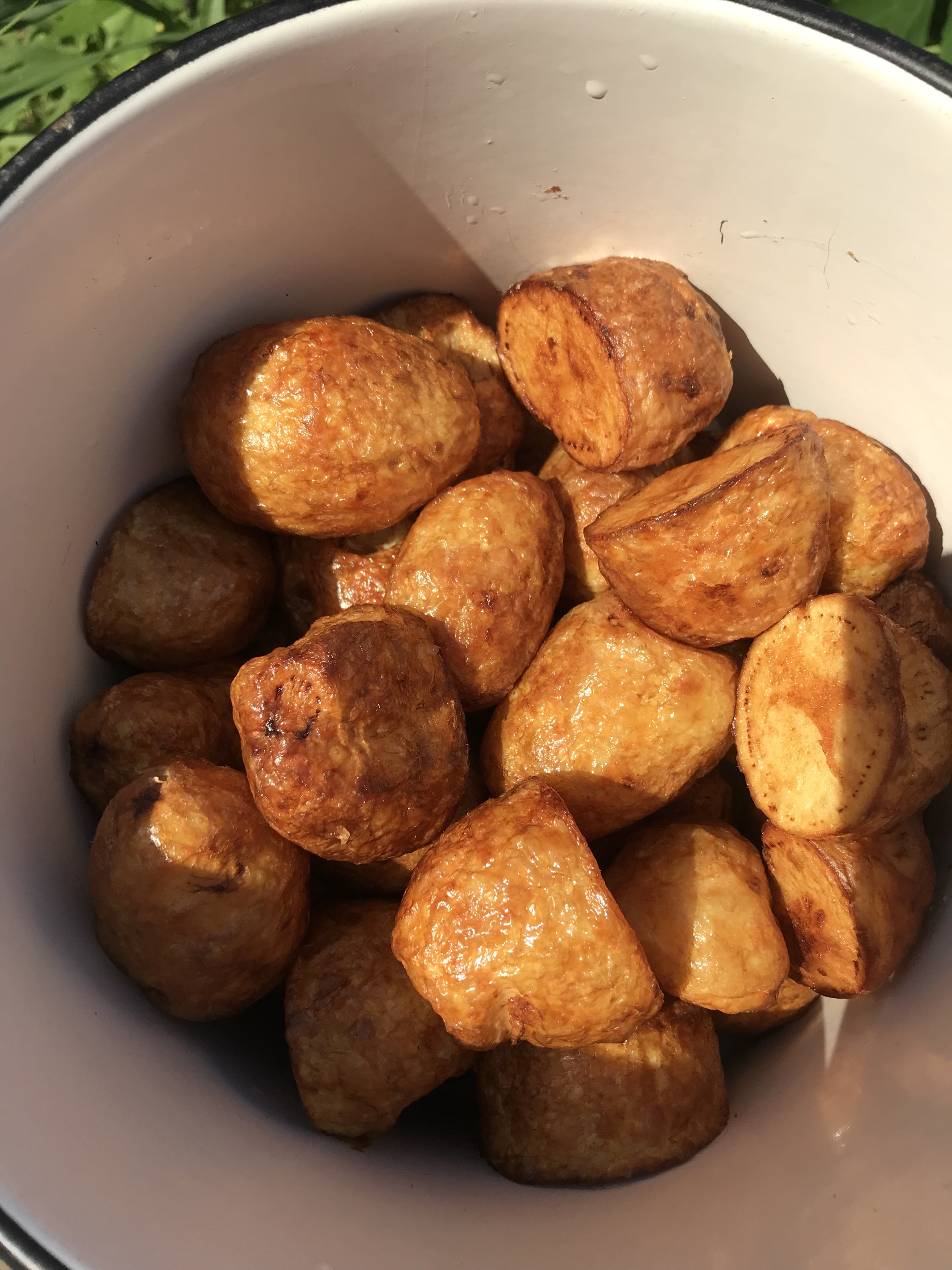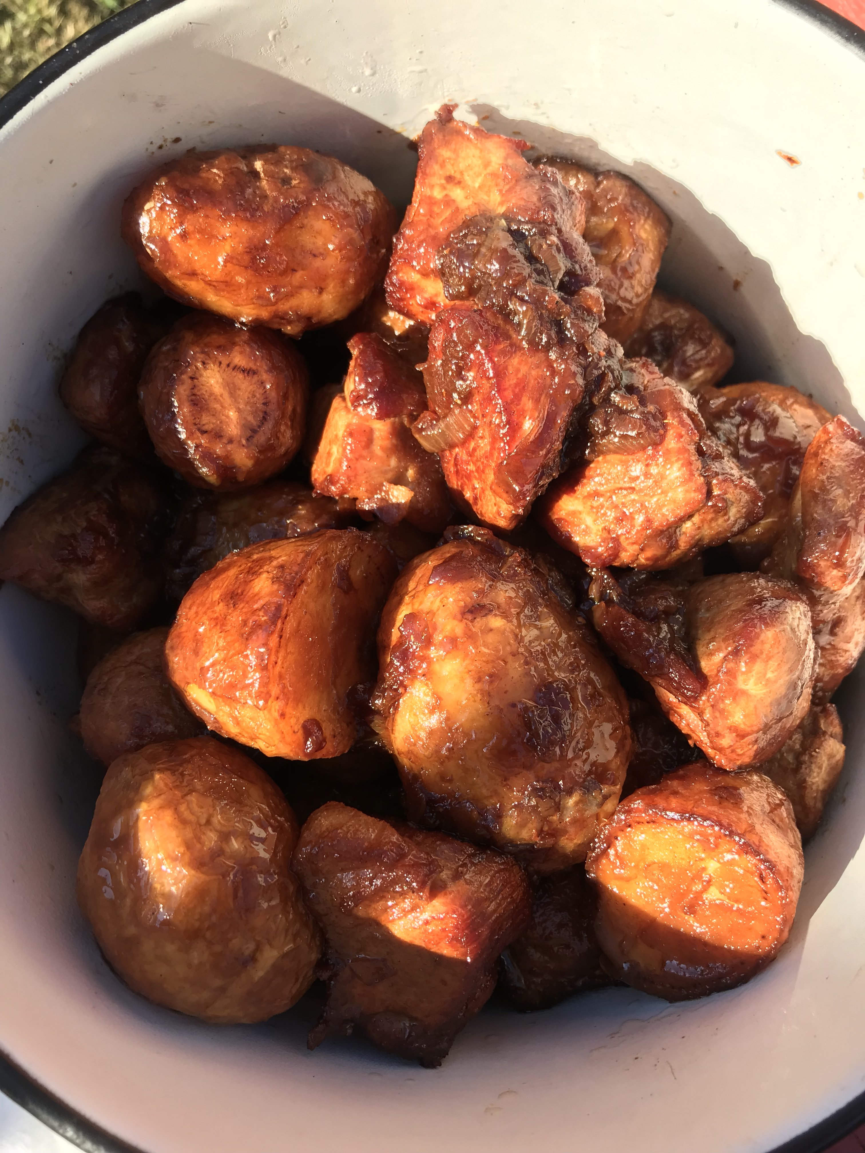 Казан кебаб/кебоб. В выходные готовила. Картошка получился просто огонь, её слопали быстрее мяса) Делала впервые. 2 кг молодого картофеля, мелкого и среднего размера, крупные размазала. 2 кг мяса, свинина с жирком была 7 шт репчатого лука среднего 700 мл растительного масла соль, перец, шепотки зиры В раскалённом масле обжарила картофель (очищенный), убрала из казана. Обжарила мясо, добавила лук, специи, картофель и немного воды (100-200мл). Закрыла крышкой и тушила до готовности. Обязательно сделаю с другими видами мяса (частей одного мяса), в следующий раз баранину на косточке куплю. Картофель надо в два раза больше по количеству. И мясо если кусами, как в этот раз, надо нарезать ещё крупнее. Зира нафиг, мускатный орех добавлю и может ещё какие-то специи (шафран, красный острый перец, розмарин, базилик, тимьян…, не знаю, надо пробовать). На тарелке выглядит на фото темным и не аппетитным, перетомила, но на вкус! Пишу и слюни глотаю))