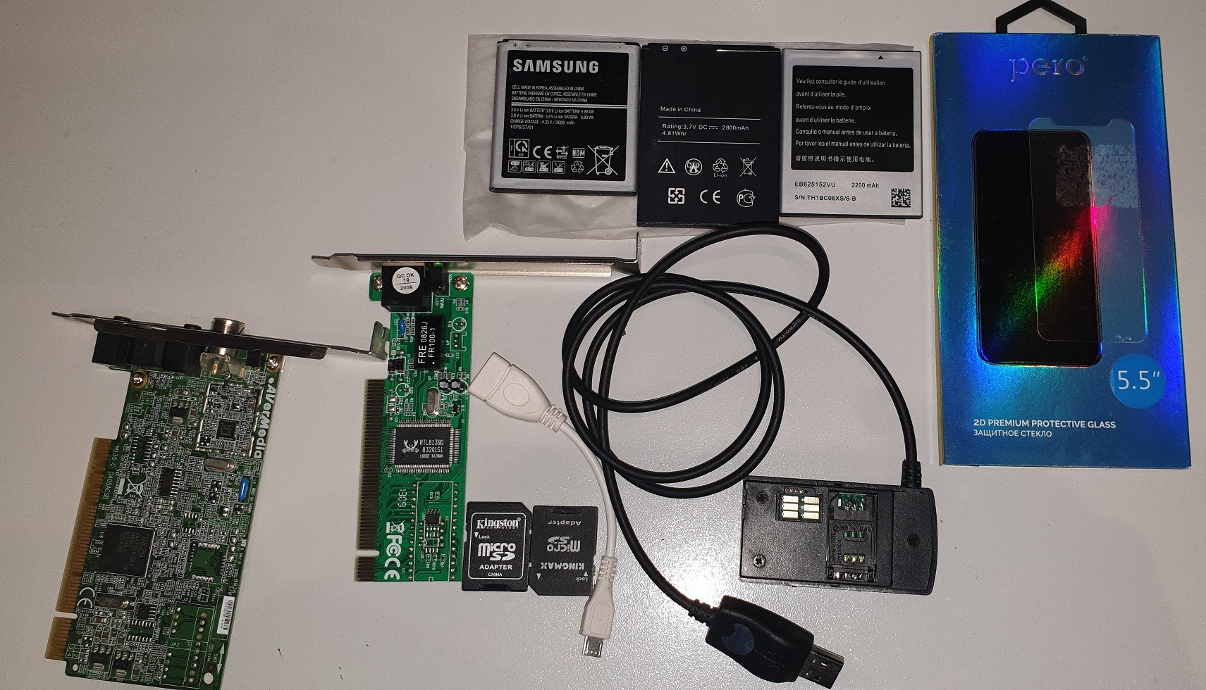 Защитное стекло 5,5", новое полудохлые/дохлые led-лампы, приобразовалели внутри, на опыты АКБ (если не ошибаюсь, не использовались но лежат давно, состояние неизвестно) ТВ-тюнер, сетевушка, переходники карт, мама-USB->microUSB, data-cable. Аллея Героев