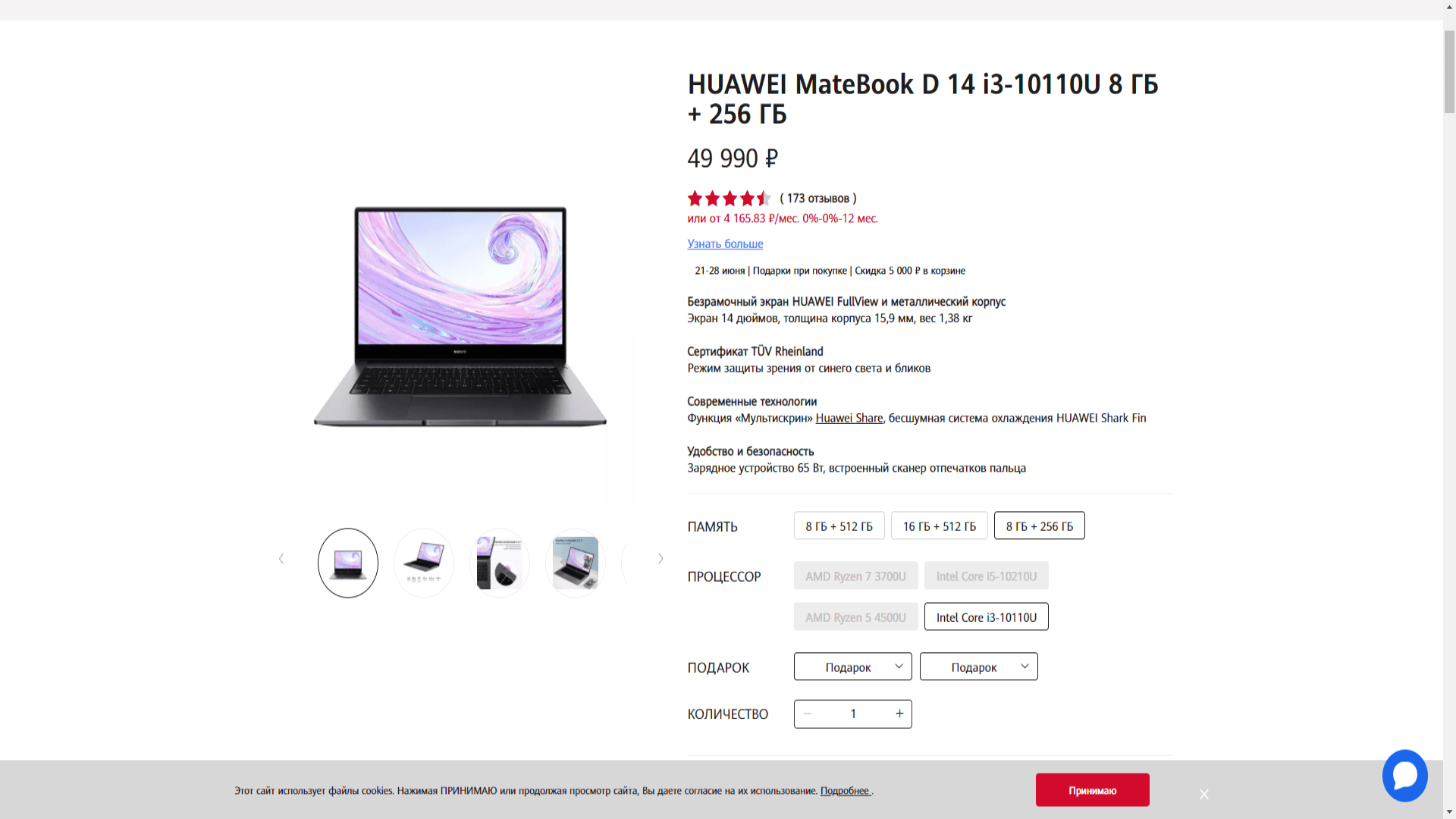 да при озвученных характеристиках они все норм но ладно вот Ryzen 3 5300U vega 6 - 4 ядра/8п 11.43%/13.84% Ryzen 5 4500U vega 6 - 6 ядер/6п 12.81%/13.84% Ryzen 5 5500U vega 7 - 6 ядер/12п 15.69%/15.30% не всем и не на все хватает потому лучше сразу сделать благо память недорого, а с ссд 512г - выбор ноутов есть ни одного не нашел. тут наверное указана цена от... по ссылке есть даже 45т, но открываешь его - 75т HUAWEI MateBook D 15 | HUAWEI Россия