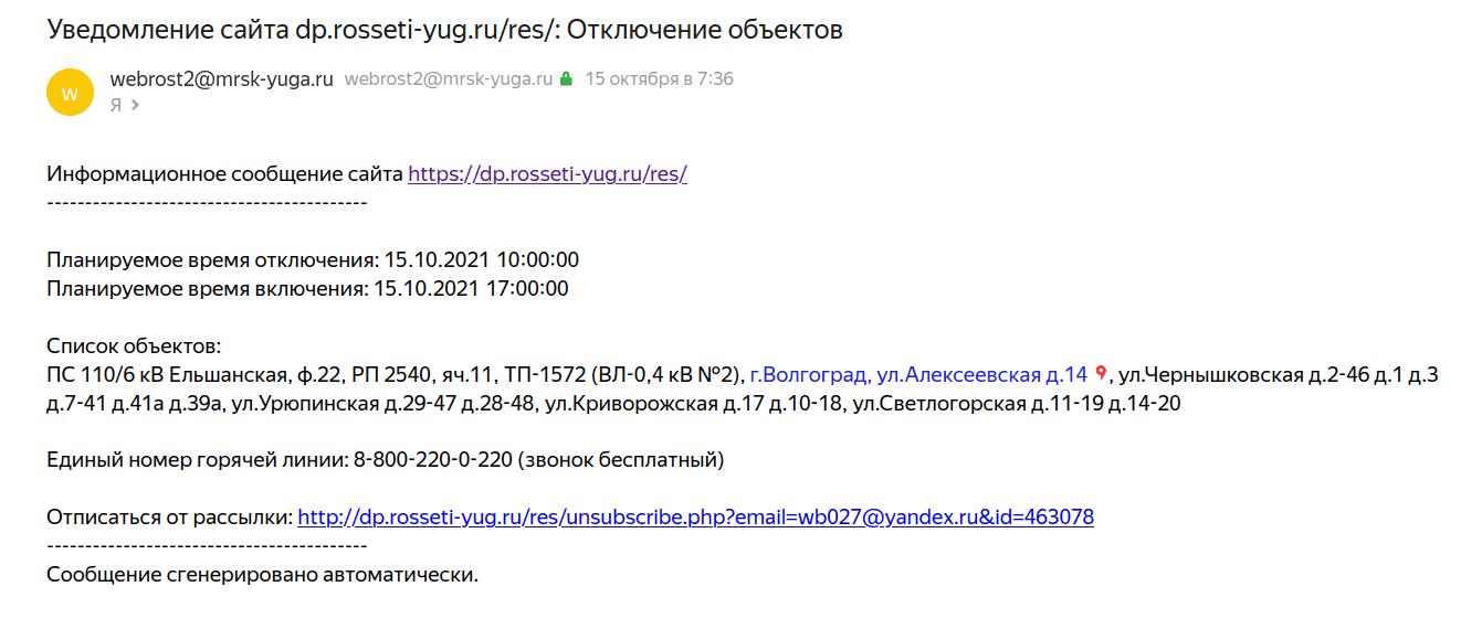 Как-то летом отключили на весь день (с 9 до 17). Диспетчерша сказала, что это плановое отключение на ремонт, и посоветовала подписаться на сайте на уведомления. Выберите РЭС С тех пор пришло два ложных уведомления об отключения по моему адресу, и было одно длительное отключение (где-то с 10 до 15), никак не отраженное на сайте. У вас есть опыт подписки на эти уведомления?
