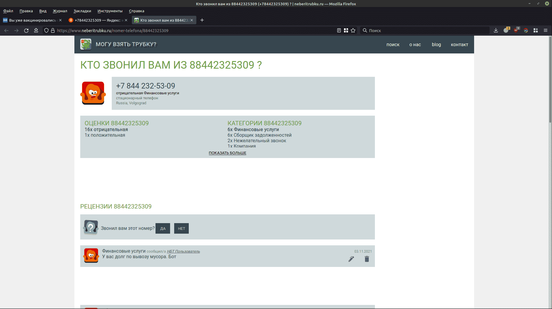 Только что звонил мусорный робот. На этот раз женским голосом с напоминанием, что платить вовремя, это хорошо и правильно, и благодарностью за своевременные платежи. Они нас читают! 8442-32-53-29 отписал на неберитрубку.