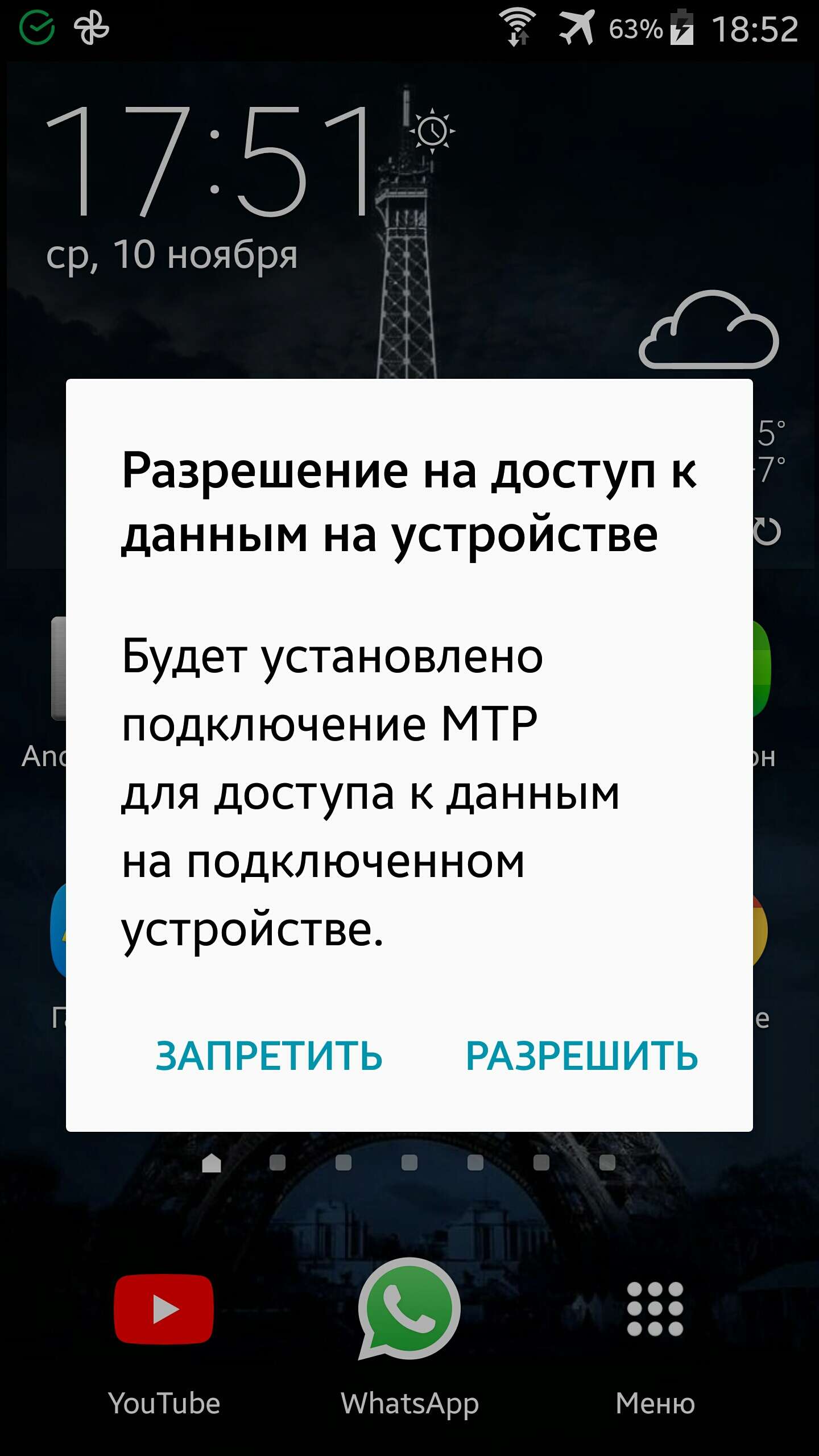 В момент подключения к компу если компьютер реагирует звуковым сигналом думаю надо тыкнуть в правый нижний угол экрана но не в самый угол а так чуть от края нижнего и чуть от края правого ,типа надо попасть в надпись разрешить.