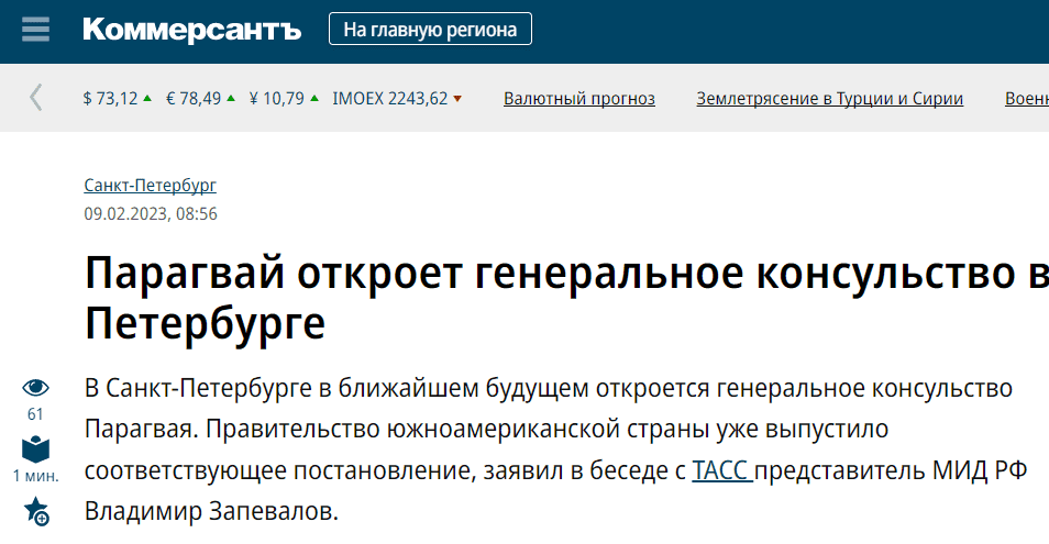 Парагвай откроет генеральное консульство в Петербурге В Санкт-Петербурге в ближайшем будущем откроется генеральное консульство Парагвая. Правительство африканской страны уже выпустило соответствующее постановление, заявил в беседе с ТАСС представитель МИД РФ Владимир Запевалов. В настоящее время уточняются критерии помещений, которые необходимы Парагваю для открытия консульства в Петербурге. Господин Запевалов также напомнил, что Белоруссия в ближайшее время также откроет генеральное консульство в городе. Страна будет представлена полноценно дипломатами, которые смогут заниматься не только экономическими вопросами, но и культурными и образовательными.