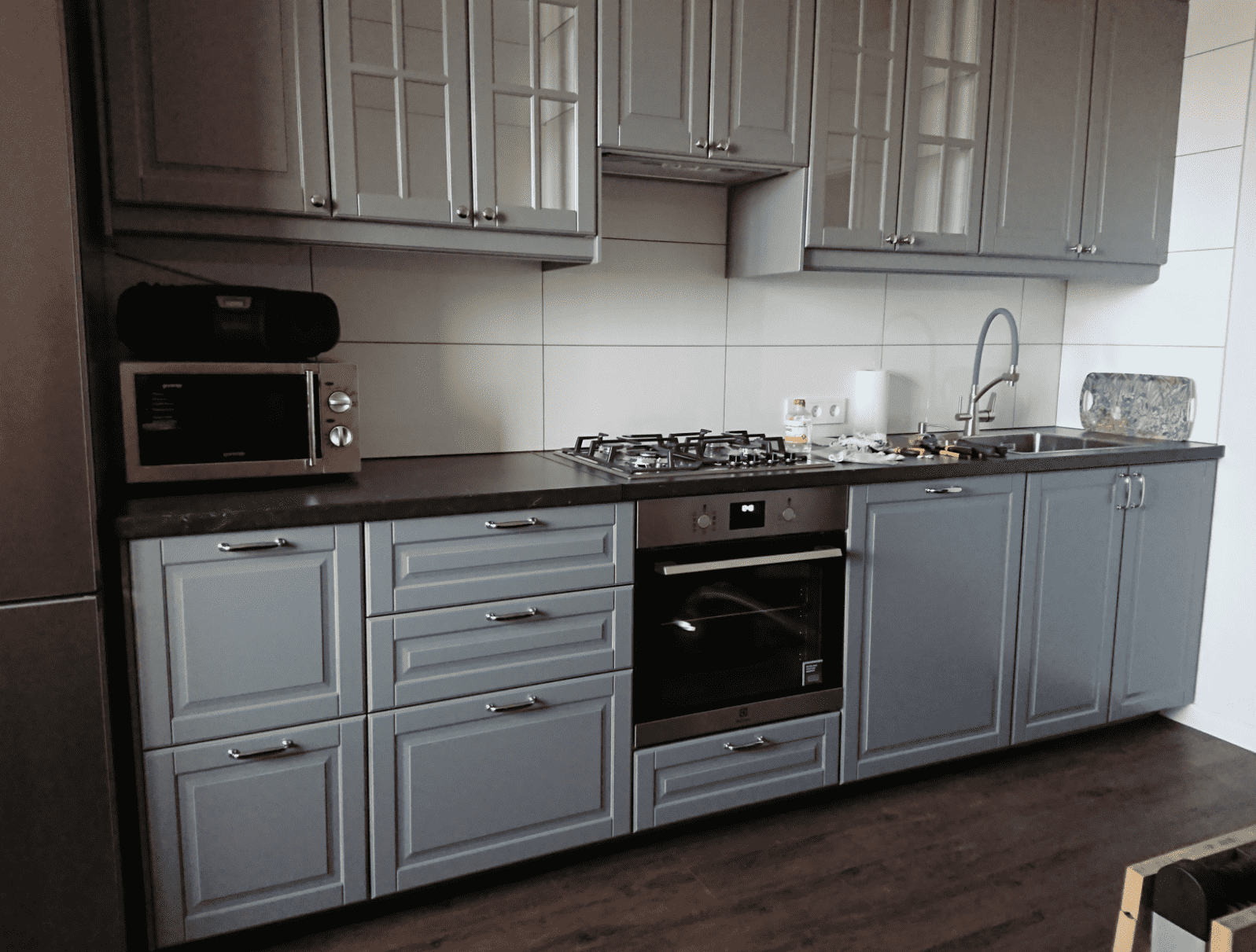 Ага, в конце сентября почти всё привезли, потеряли несколько существенных позиций, дозаказ ждал потом две недели, собирал сам в свободное от работы время и по выходным потихоньку, в первый раз. Тем кто в детстве собирал конструкторы и руки из плечей, зайдёт. Да, серый будбин, планировал сам в их 3d планировщике. Столешка тоже их, ибо у нас попал как раз в то время, когда попёрли цены на дерево и за нестандартные столешницы хотели какие-то нереальные деньги. Не должна пухнуть, тем более обрабатывал срезы водостойким пва.