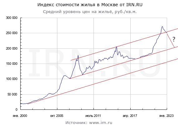 Думаю, что есть несколько причин. 1. Рынок недвижимости инертен. Коррекция начала проявляться полгода назад, минимум цен мы увидим через 2 - 3 года после их максимальных значений в постковидный период. 2. Объём денежной массы (М2) очень сильно вырос. Всё видно на графике. Эти деньги в обращении или на счетах в банках. Средства как финансовых организаций, так и физических лиц. Немалая часть которых идёт в бетон, личный опыт. Представьте, что вам надо сохранить ваш пенсионный капитал в текущих условиях. Биржа, банк или что-то ещё? Что? Таких сделок всё меньше, но они были два года без остановок и, как следствие, цены ушли сильно вверх. 3. Валюта. В 1998-м я видел, как рубль кратно слабел, и кто был в $, значительно увеличили свой фин. потенциал. Однушки в Москве тогда стоили 15 т. долларов, двушки около 20 тысяч и тд.. Власти учли этот опыт и очень грамотно /на мой взгляд/ избежали обвала в этот раз. Насколько долго это у них получится делать, - вопрос. Допускаю, что в прошедшие два года был значительный отток из валюты в кв.метры, когда были пиковые значения курсов. Предположу, что на сл. скачке курса также многие захотят выйти из долларов и евро и зафиксировать прибыль. В дальнейшем предполагаю коррекцию на РН и в рублях, и в валюте. Как на графике. Отличие в том, что в рублях это будет именно коррекция, а в валюте это глобальный тренд вниз.
