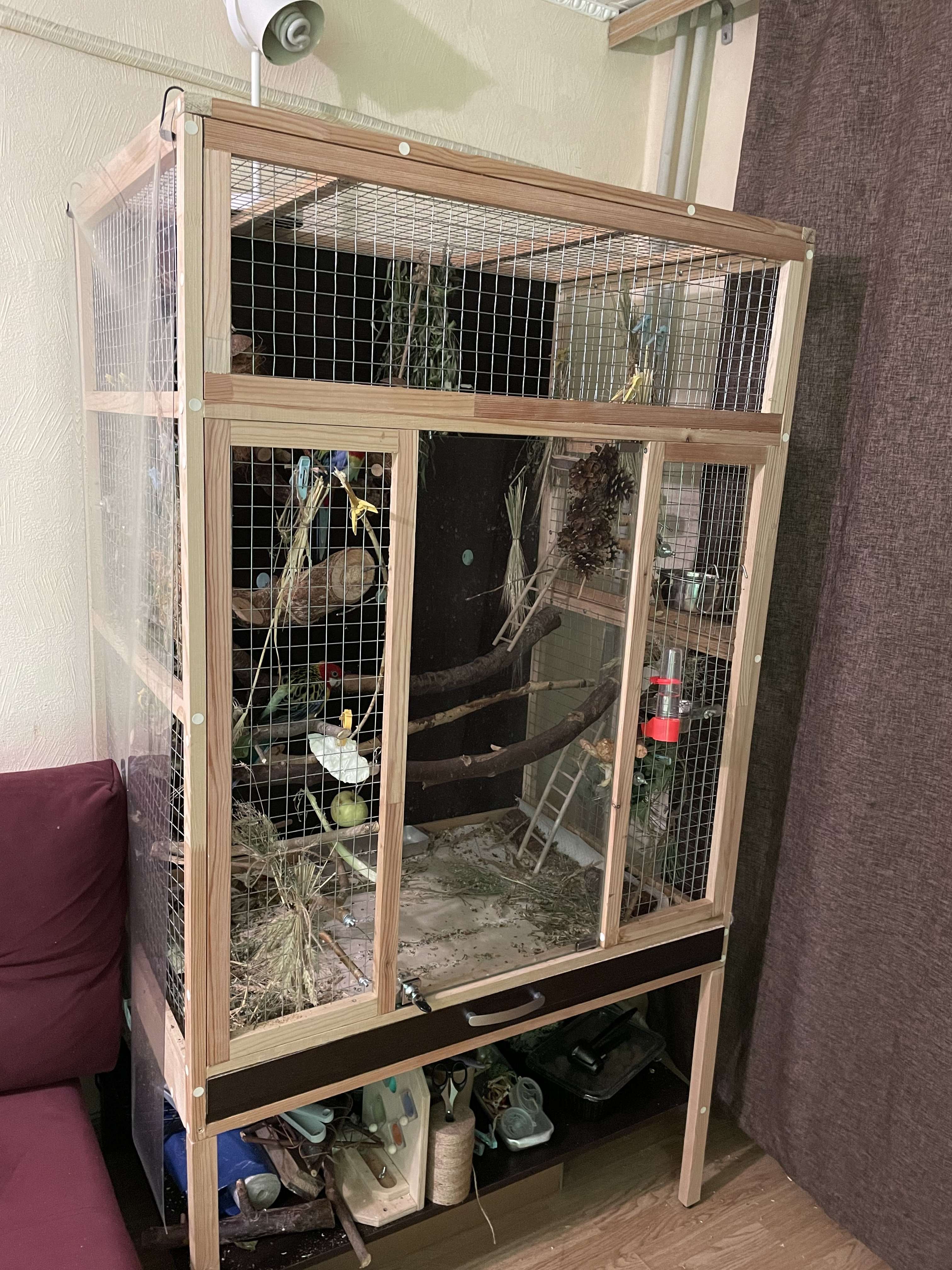 Рекомендую бросить эту затею, у самого живут две розеллы. Любой попугай это не игрушка, требует огромный вольер и желательно свободный полёт, в процессе которого будет неизбежно разругаться квартира, в первую очередь обои. У заводчика он будет ещё и полусумасшедший, если выкормыш. На фотографии так себе вольер, но в нем постоянно есть свежая зелень(сейчас практически ничего не висит, завтра очередная замена), различные палки и постоянно меняются жерди, это содержание на четыре с минусом. Готовы к такому? Не издевайтесь над собой и птицей.