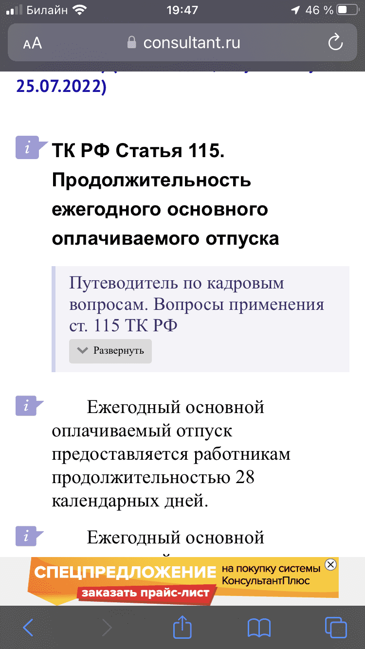 Нет, в трудовом кодексе ничего подобного не написано. Давайте я объясню, как я все это понимаю: Итак, ст.115 гласит: Ежегодный основной оплачиваемый отпуск предоставляется работникам продолжительностью 28 календарных дней. Не до 28 дней, а точное конкретное значение - 28 дней. Далее уточняется, что может быть больше. Про меньше ничего нет. Т.е. ежегодный оплачиваемый отпуск не может быть менее 28 дней. Ок, идем дальше. Когда же работник сможет получить право на этот отпуск в 28 дней? ст.122 ТК РФ Оплачиваемый отпуск должен предоставляться работнику ежегодно. Право на использование отпуска за первый год работы возникает у работника по истечении шести месяцев его непрерывной работы у данного работодателя. ... Отпуск за второй и последующие годы работы может предоставляться в любое время рабочего года в соответствии с очередностью предоставления ежегодных оплачиваемых отпусков, установленной у данного работодателя. Таким образом, через полгода сотрудник имеет право на ежегодный отпуск. На отпуск в 28 дней. Трудовой кодекс позволяет делить отпуск на части, хотя бы одна из которых не может менее 14 дней, но тут уже речь идет о делении отпуска в 28 дней на части. Может возникнуть неясность с терминами "первый год работы", "второй год".... и т.д. Насколько я понял, трактоваться это должно так: Человек устроился 20 января 2022, на дворе август. Идет первый год его работы, в котором он непрерывно уже отработал 6 месяцев. 20 января 2023 первый год работы закончится. И в течение этого года работы работнику должны были дать отпуск. (он предоставляться должен ежегодно, ст.122). 21 января 2023 начинается второй год работы. И согласно той же ст.122 ничего не мешает работнику уйти уже в другой отпуск, если, конечно его руководство не против (графики там и все такое). И отпуск этот опять не может быть менее 28 дней. Если я не прав, ткните пжлст, где именно.